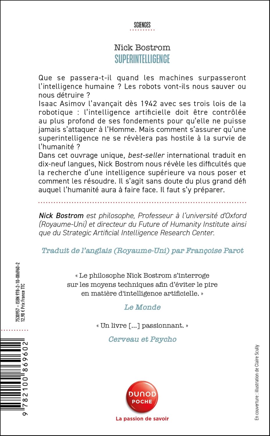 Mais comment s'assurer qu'une superintelligence ne se révèlera pas hostile à la survie de l'humanité ? Dans cet ouvrage unique, best-seller international traduit en dix-neuf langues, Nick Bostrom nous révèle les difficultés que la recherche d'une intelligence supérieure va nous poser et comment les résoudre.