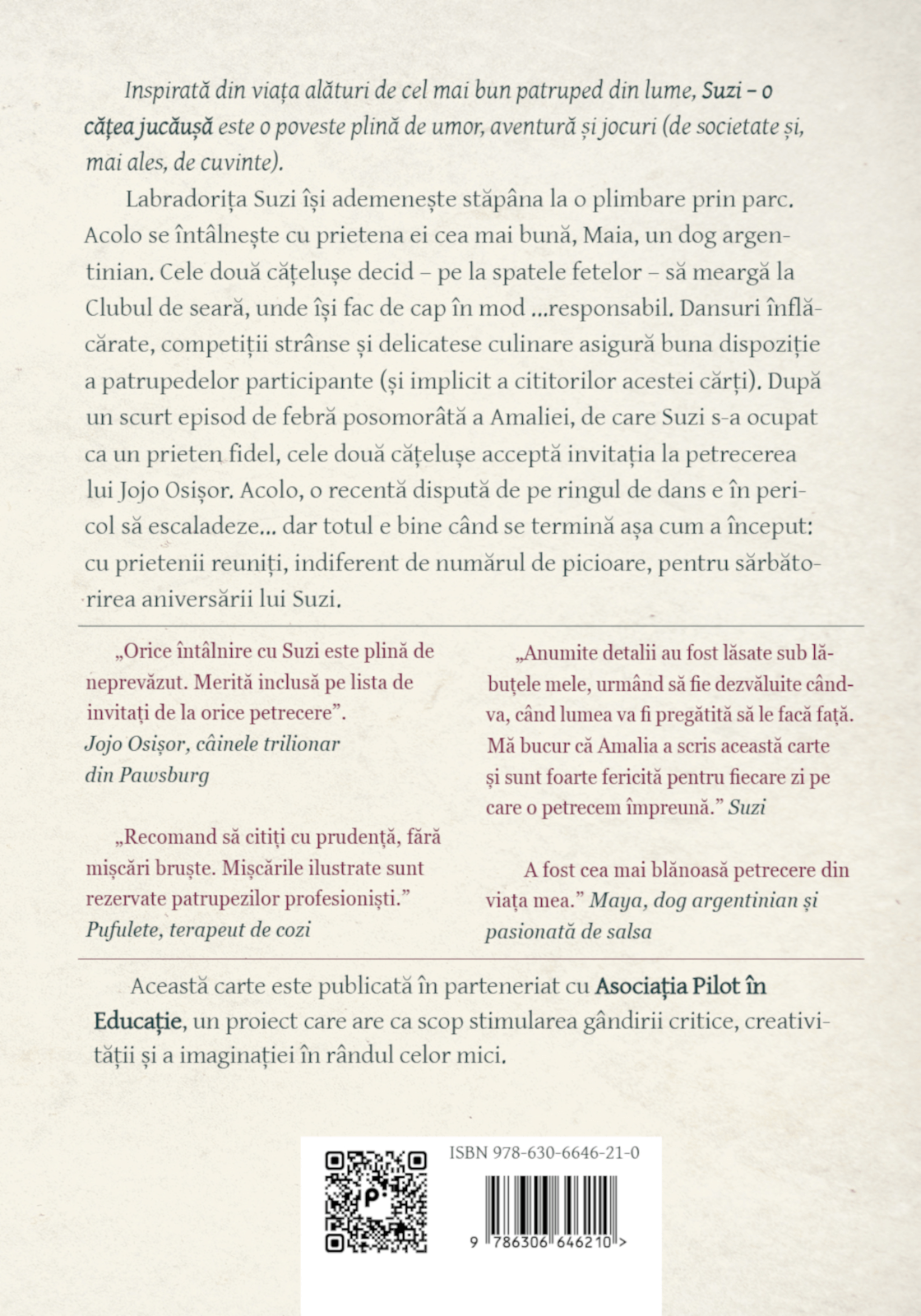 Inspirată din viața alături de cel mai bun patruped din lume, Suzi – o cățea jucăușă este o poveste plină de umor, aventură și jocuri (de societate și, mai ales, de cuvinte).