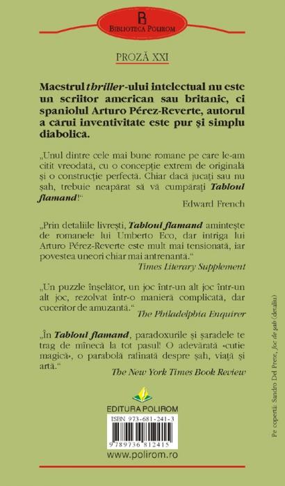 „Tabloul flamand” (1990), bestseller atit in Spania, cit si in tarile in care a fost tradus, a fost incununat, in Franta, cu Marele Premiu pentru Roman Politist. O restauratoare de arta gaseste o inscriptie misterioasa in forma unei table de sah pe un tablou al unui pictor flamand din secolul al XV-lea. Surprinzatoarea descoperire determina o galerie intreaga de personaje sa inceapa o aventura plina de riscuri pentru a dezlega enigma. Dar nu e vorba de o enigma oarecare: aceasta constituie cheia unui secret care ar fi putut sa schimbe istoria Europei. Miscarile de sah marcheaza, pas cu pas, succesul sau esecul anchetei, mereu pindita de diabolicul joc de capcane si echivocuri, la care participa nu numai pictura, ci si muzica, literatura, istoria si matematica. Thriller, roman psihologic si poveste de dragoste, „Tabloul flamand” demonstreaza prodigioasa inteligenta si imaginatia debordanta a lui Perez-Reverte, autorul fiind, prin numeroasele aluzii culturale necesare eludarii enigmei, un Umberto Eco spaniol care manevreaza suspansul mult mai strins, naratiunea sa fiind cu mult mai incitanta.