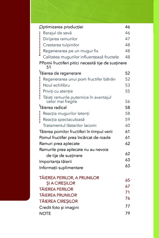 Taierea pomilor fructiferi necesita o intelegere a pomului si a mediului sau. Cartea Taierea pomilor fructiferi este, inainte de toate, un document practic de referinta, in care arborele isi dezvaluie secretele, iar omul isi foloseste stiinta si arta pentru a culege roadele muncii sale.
