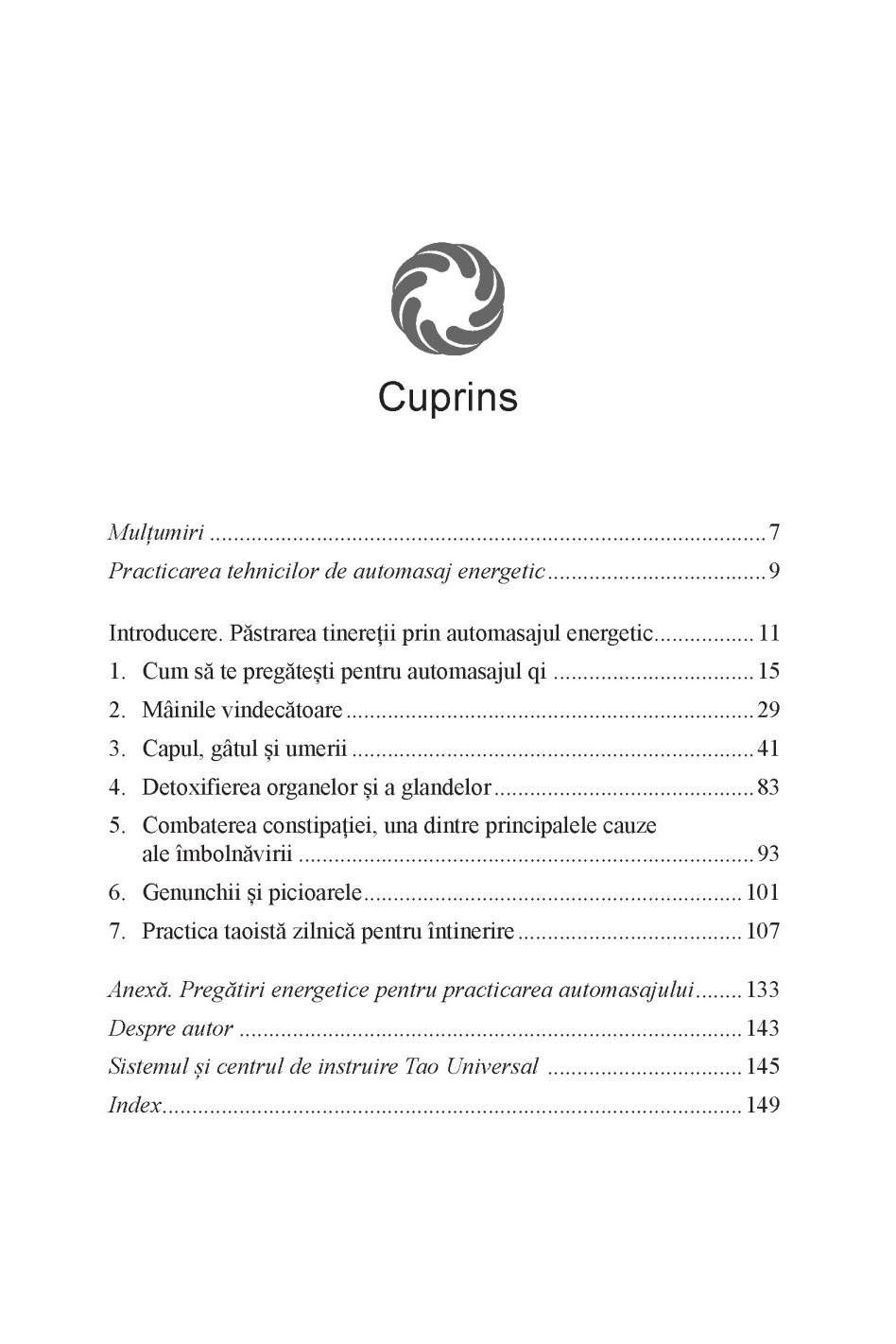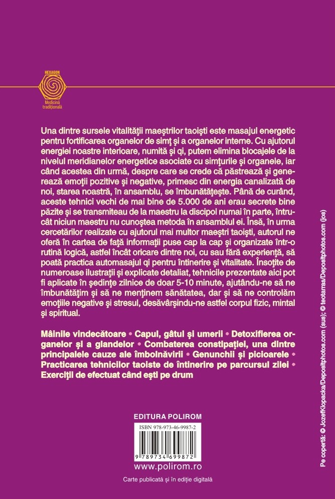 Până de curând, aceste tehnici vechi de mai bine de 5.000 de ani erau secrete bine păzite și se transmiteau de la maestru la discipol numai în parte, întrucât niciun maestru nu cunoștea metoda în ansamblul ei. Însă, în urma cercetărilor realizate cu ajutorul mai multor maeștri taoiști, autorul ne oferă în cartea de față informații puse cap la cap și organizate într-o rutină logică, astfel încât oricare dintre noi, cu sau fără experiență, să poată practica automasajul qi pentru întinerire și vitalitate.
