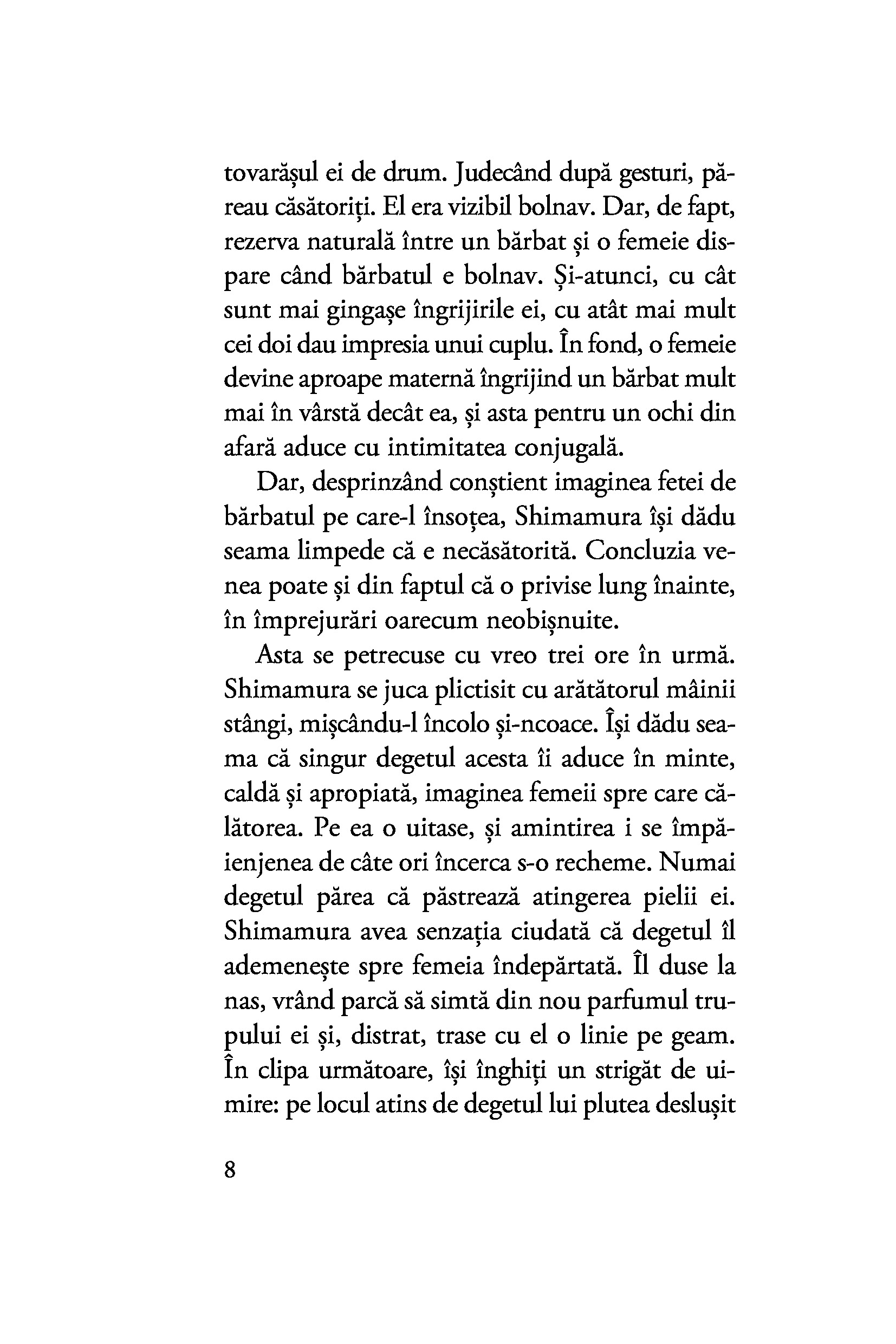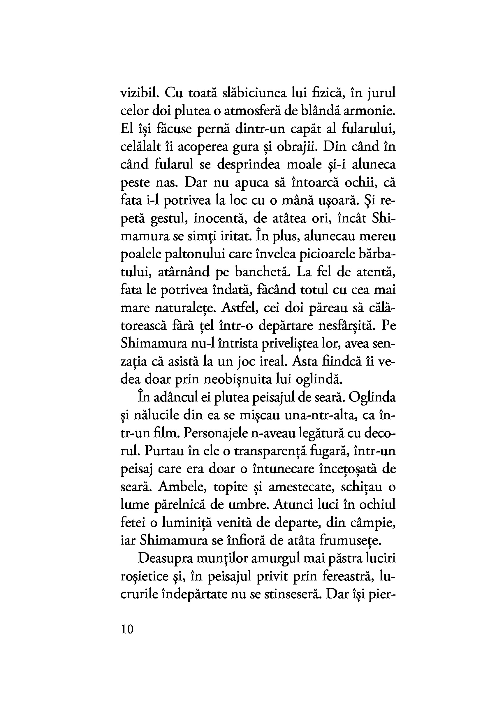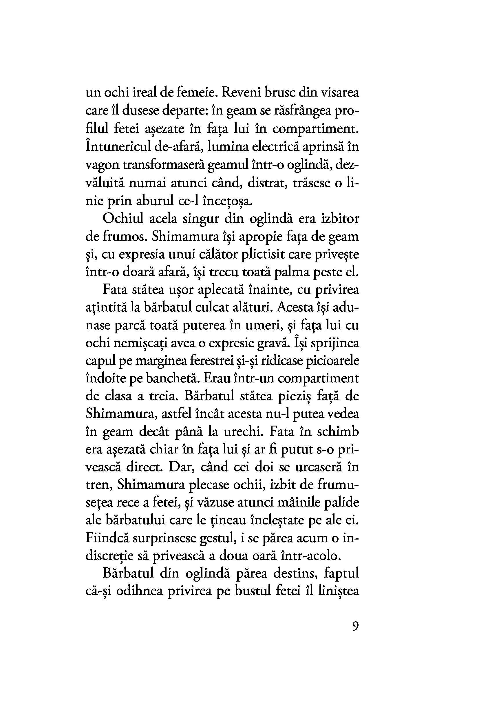 Shimamura are obiceiul de a se retrage iarna într-o micuță stațiune montană, lăsând în urmă agitația capitalei și viața de familie. Aici, în „țara zăpezilor“, o întâlnește pe tânăra gheișă Komako, a cărei franchețe deconcertantă este pe punctul de a-i tulbura bărbatului echilibrul. Oscilând între afecțiunea fățișă și necondiționată a gheișei și farmecul misterios al tăcutei Yoko, al cărei chip îl deslușește fugar, Shimamura este mereu un om al inacțiunii, iar pasivitatea lui o condamnă pe Komako să rămână prinsă fără scăpare în păienjenișul relațiilor și obligațiilor din țara zăpezilor.