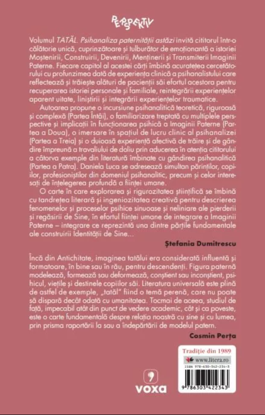 Volumul TATĂL. Psihanaliza paternității astăzi invită cititorul într-o călătorie unică, cuprinzătoare și tulburător de emoționantă a istoriei Moștenirii, Construirii, Devenirii, Menținerii și Transmiterii Imaginii Paterne.