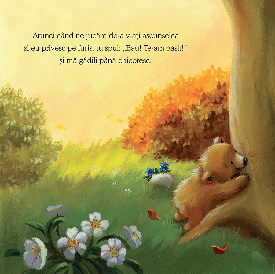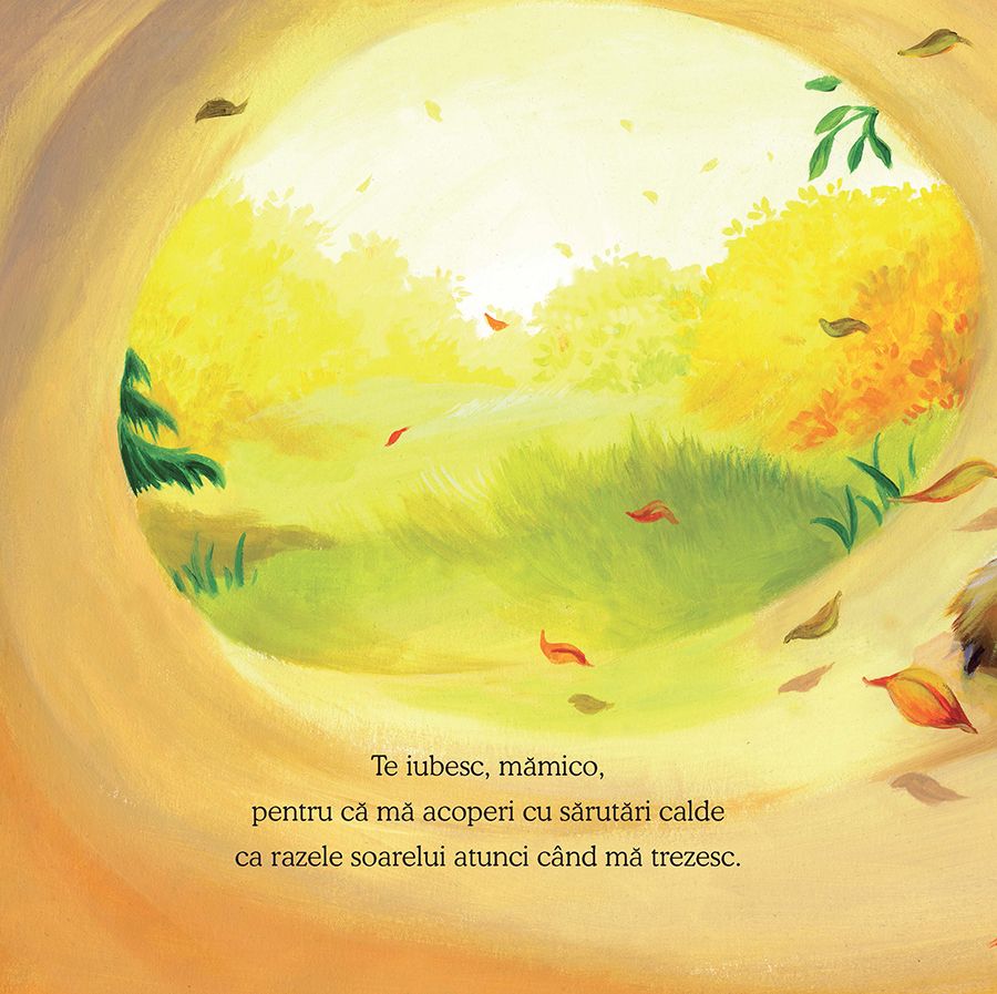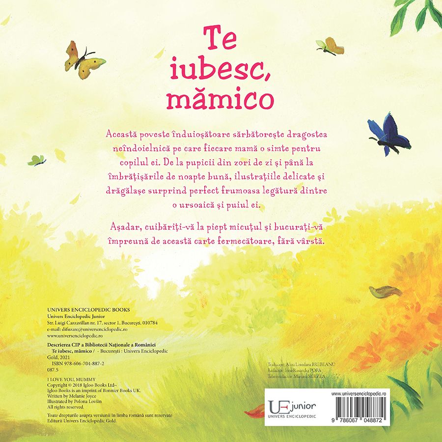 Această poveste înduioşătoare sărbătoreşte dragostea neîndoielnică pe care fiecare mamă o simte pentru copilul ei. De la pupicii din zori de zi şi până la îmbrăţişările de noapte bună, ilustraţiile delicate şi drăgălaşe surprind perfect frumoasa legătură dintre o ursoaică şi puiul ei. Aşadar, cuibăriţi-vă la piept micuţul şi bucuraţi-vă împreună de această carte fermecătoare, fără vârstă.