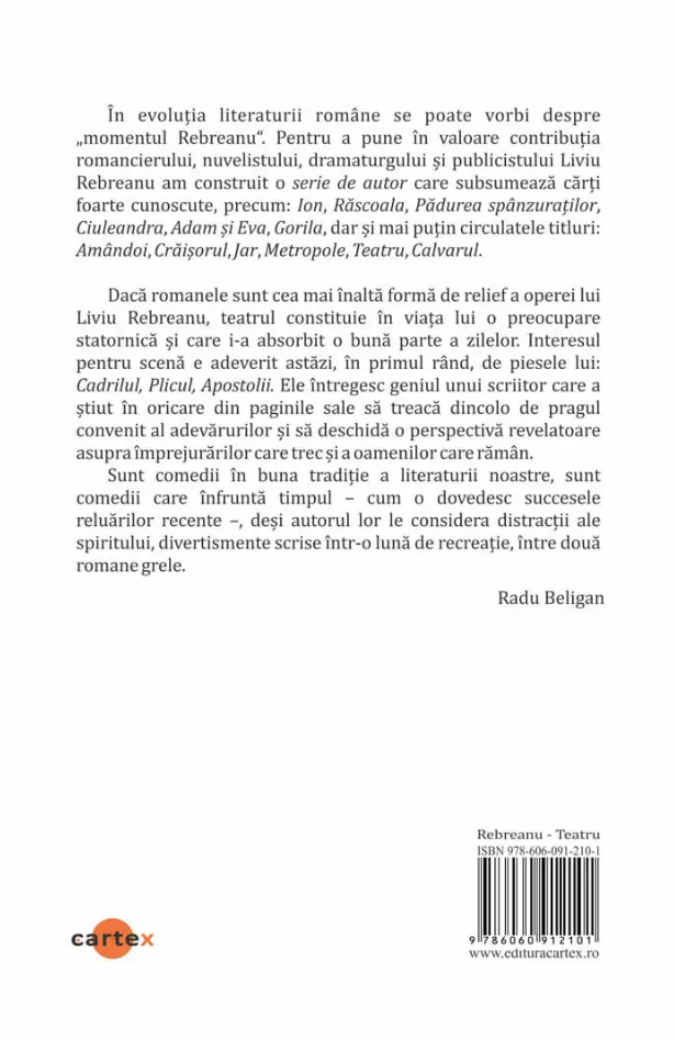 Cunoscut mai ales ca prozator, prin romanele si nuvelele de introspective sociala si psihologica, Liviu Rebreanu s-a remarcat printr-o profunda cunoastere a atmosferei si creatiilor teatrale ale epocii sale, analizate atat contextual, prin referire la alte fenomene artistice, cat si in cee ace le individualizeaza systematic.