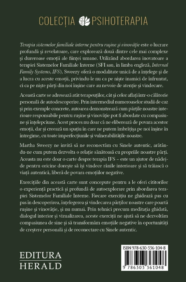 Terapia sistemelor familiale interne pentru rusine si vinovatie este o lucrare profunda si revelatoare, care exploreaza doua dintre cele mai complexe si dureroase emotii ale fiintei umane. Utilizand abordarea inovatoare a terapiei Sistemelor Familiale Interne (SFI sau, in limba engleza, Internal Family Systems, IFS), Sweezy ofera o modalitate unica de a intelege si de a lucra cu aceste emotii, privindu-le nu ca pe niste inamici de infruntat, ci ca pe niste parti din noi insine care au nevoie de atentie si vindecare.
