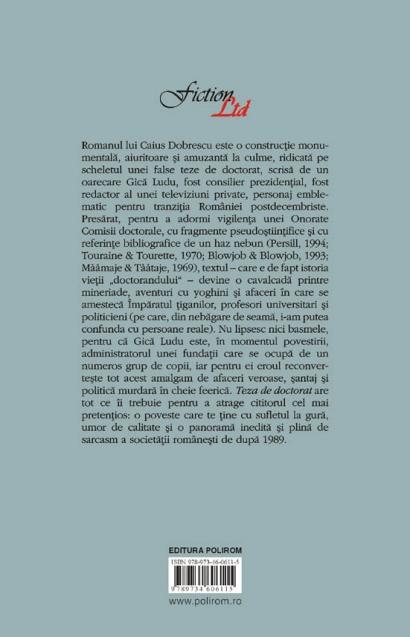 Romanul lui Caius Dobrescu este o constructie monumentala, aiuritoare si amuzanta la culme, ridicata pe scheletul unei false teze de doctorat, scrisa de un oarecare Gica Ludu, fost consilier prezidential, fost redactor al unei televiziuni private, personaj emblematic pentru tranzitia Romaniei postdecembriste. Presarat, pentru a adormi vigilenta unei Onorate Comisii doctorale, cu fragmente pseudostiintifice si cu referinte bibliografice de un haz nebun (Persill, 1994, Touraine & Tourette, 1970, Blowjob & Blowjob, 1993, Maamaje & Taataje, 1969), textul - care e de fapt istoria vietii „doctorandului” - devine o cavalcada printre mineriade, aventuri cu yoghini si afaceri in care se amesteca Imparatul tiganilor, profesori universitari si politicieni (pe care, din nebagare de seama, i-am putea confunda cu persoane reale). Nu lipsesc nici basmele, pentru ca Gica Ludu este, in momentul povestirii, administratorul unei fundatii care se ocupa de un numeros grup de copii, iar pentru ei eroul reconverteste tot acest amalgam de afaceri veroase, santaj si politica murdara in cheie feerica. Teza de doctorat are tot ce ii trebuie pentru a atrage cititorul cel mai pretentios: o poveste care te tine cu sufletul la gura, umor de calitate si o panorama inedita si plina de sarcasm a societatii romanesti de dupa 1989.