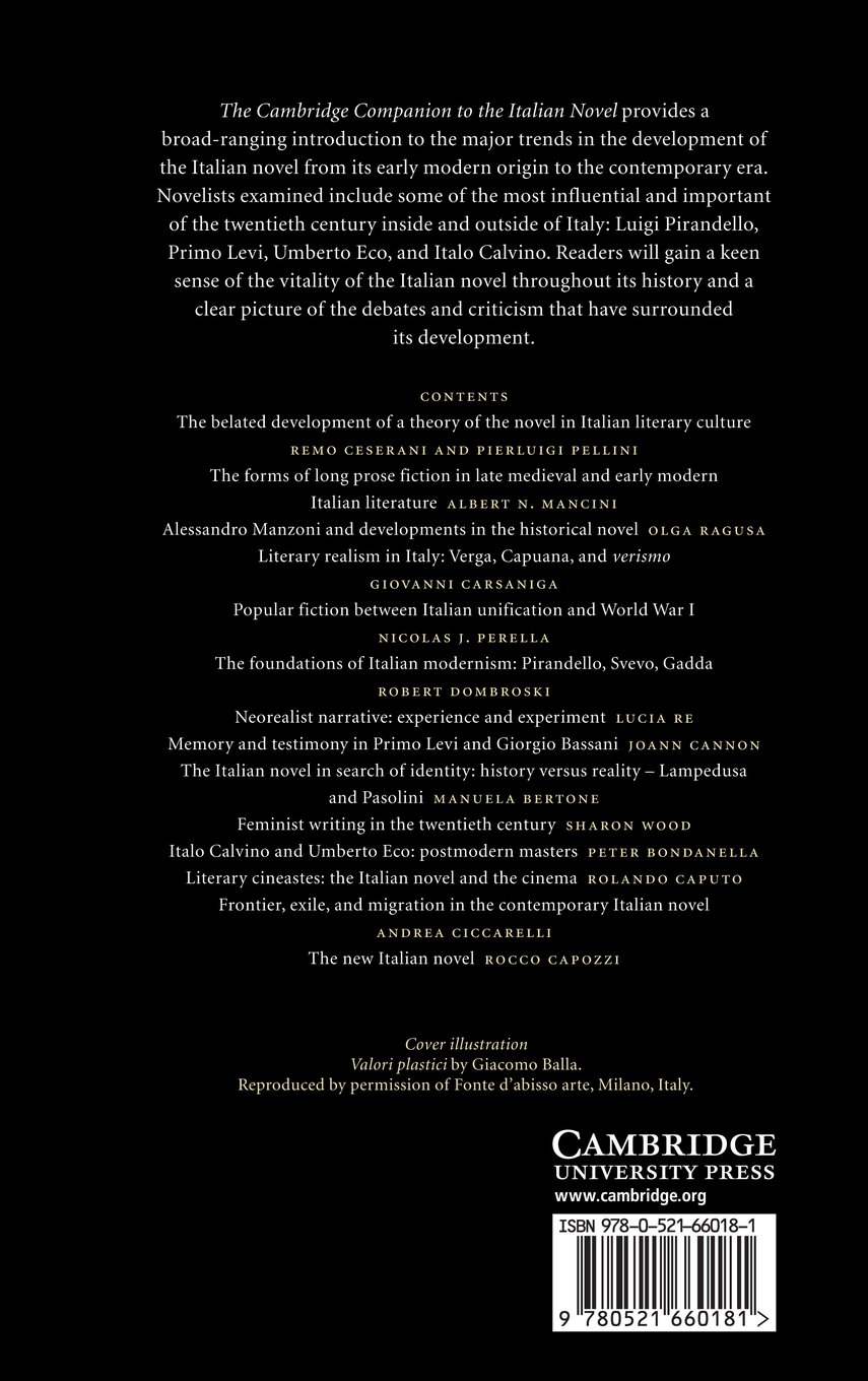 The Cambridge Companion to the Italian Novel provides a broad ranging introduction to the major trends in the development of the Italian novel from its early modern origin to the contemporary era. Contributions cover a wide range of topics including the theory of the novel in Italy, the historical novel, realism, modernism, postmodernism, neorealism, and film and the novel. The contributors are distinguished scholars from the United Kingdom, the United States, Italy, and Australia. Novelists examined include some of the most influential and important of the twentieth century inside and outside Italy: Luigi Pirandello, Primo Levi, Umberto Eco and Italo Calvino. This is a unique examination of the Italian Novel, and will prove invaluable to students and specialists alike. Readers will gain a keen sense of the vitality of the Italian novel throughout its history and a clear picture of the debates and criticism that have surrounded its development.
