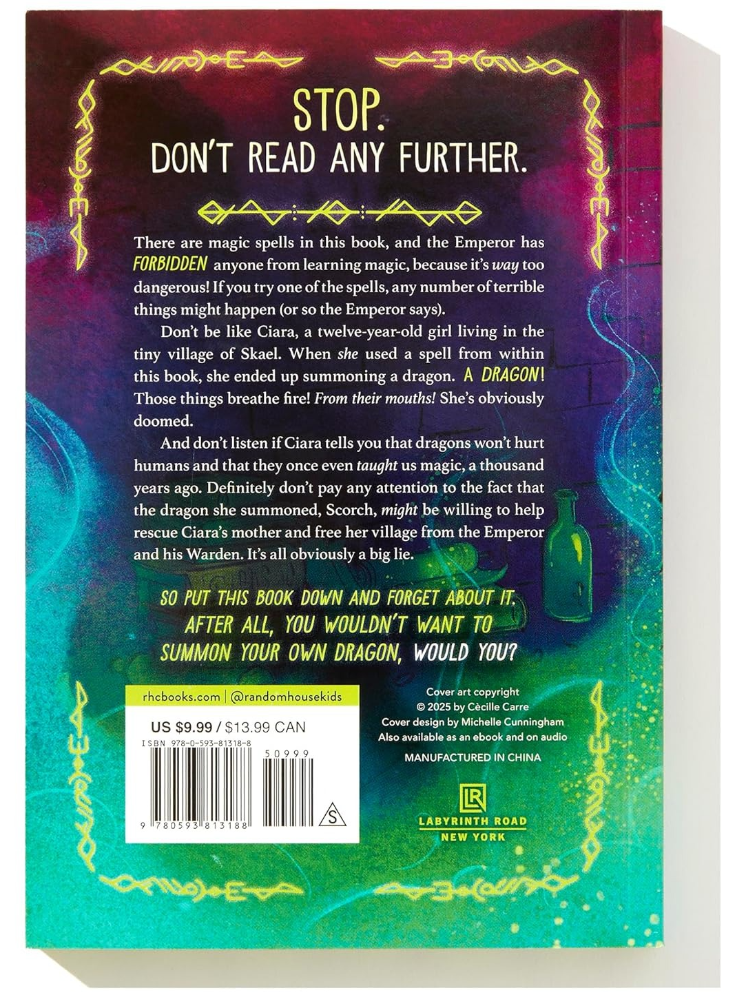 There are magic spells in this book, and the Emperor has forbidden anyone from learning magic, because it's way too dangerous! If you try one of the spells, any number of terrible things might happen (or so the Emperor says). Don't be like Ciara, a twelve-year-old girl living in the tiny village of Skael. When she used a spell from within this book, she ended up summoning a dragon. A DRAGON!