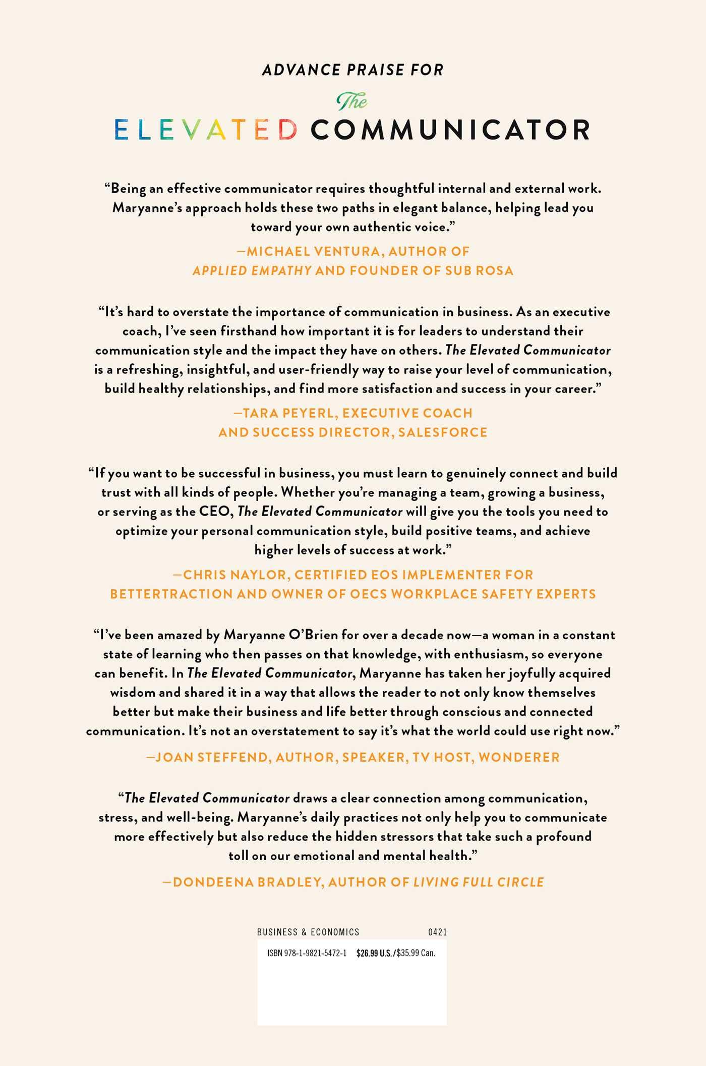 Perfect for fans of StrengthsFinder 2.0 and Gretchen Rubin’s The Four Tendencies, The Elevated Communicator’s personalized, mindful approach inspires readers to develop daily practices to spiral up, raise consciousness, inspire accountability, and discover their full potential at work.