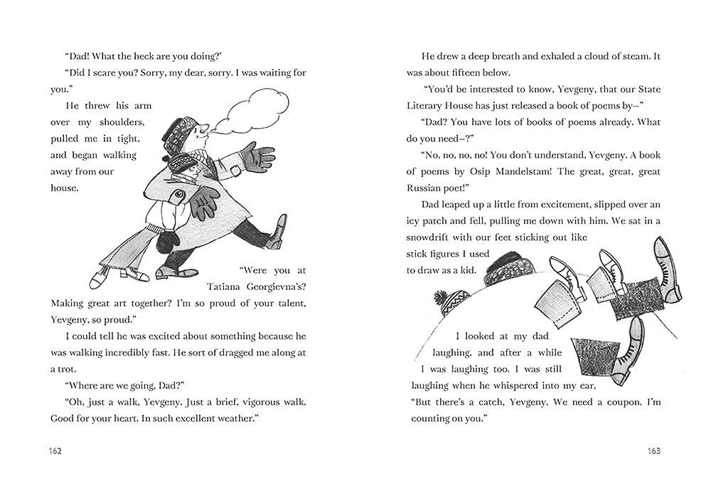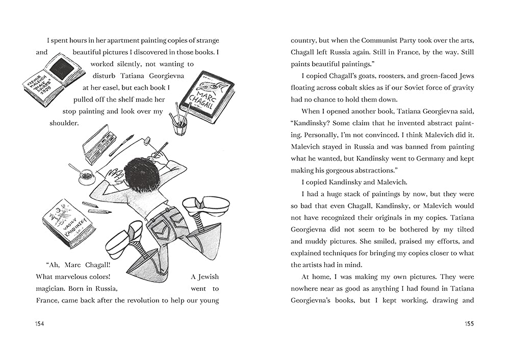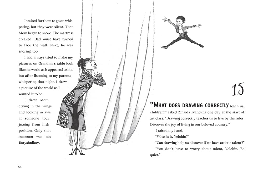 Drama, family secrets, and a KGB spy in his own kitchen! How will Yevgeny ever fulfill his parents' dream that he become a national hero when he doesn't even have his own room? He's not a star athlete or a legendary ballet dancer. In the tiny apartment he shares with his Baryshnikov-obsessed mother, poetry-loving father, continually outraged grandmother, and safely talented brother, all Yevgeny has is his little pencil, the underside of a massive table, and the doodles that could change everything. With equal amounts charm and solemnity, award-winning author and artist Eugene Yelchin recounts in hilarious detail his childhood in Cold War Russia as a young boy desperate to understand his place in his family.