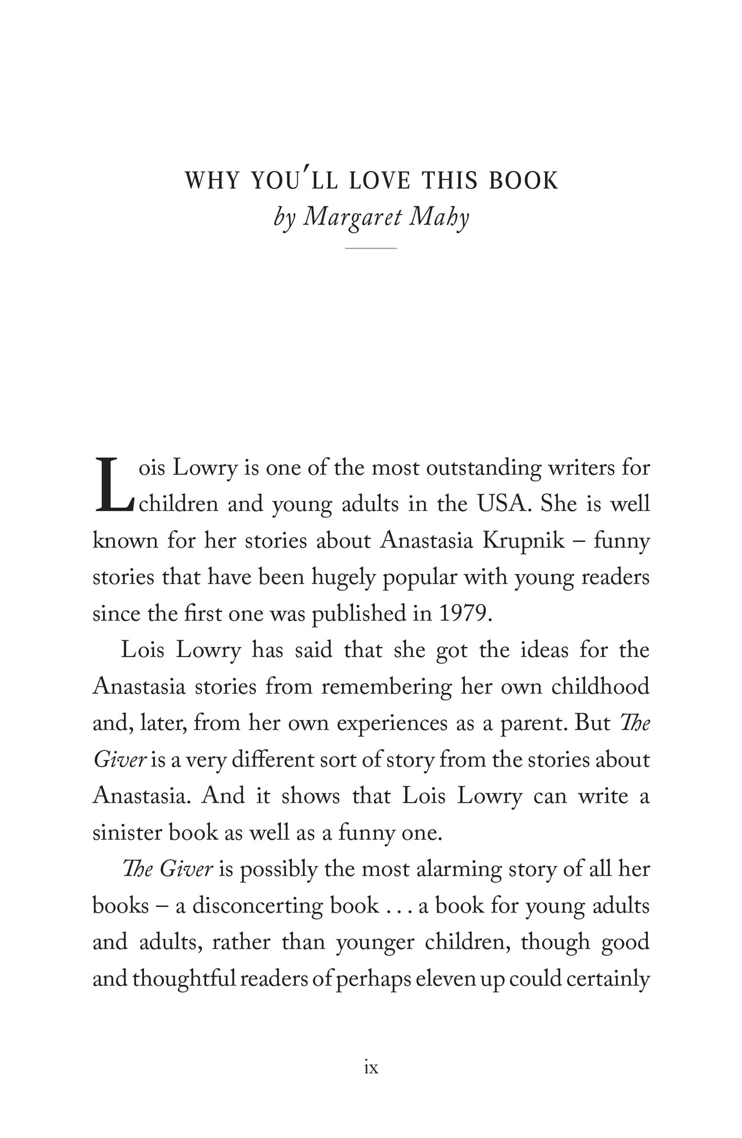 Simply and beautifully written, The Giver is sure to touch the heart of every reader. Lois Lowry deals with issues of everyday life that are so often taken for granted.Through the noble character of Jonas, she presents a glimpse of what could be the future. As the tension in the novel mounts, so does the number of questions that Lowry confronts the reader with. The Giver is a book of courage and adventure, and most importantly, one of deep thought. Once readers make contact with Lowry's treasure, they may never see things exactly quite the same. Lowry presents a forceful novel that demands to be heard and philosophically dealt with.