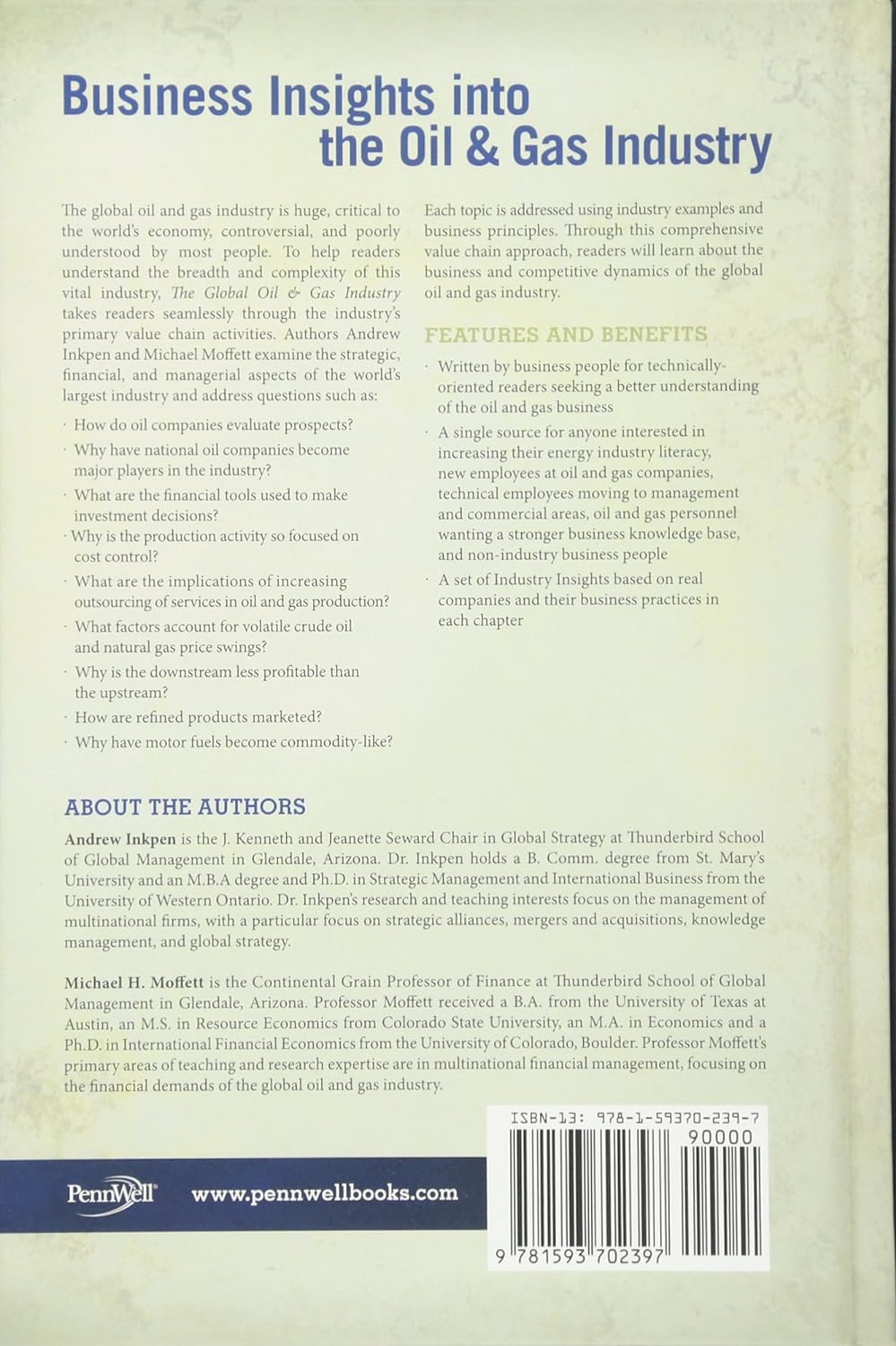 Despite its size and importance, a surprising lack of basic knowledge exists about the oil and gas industry. With their timely new book, authors Andrew Inkpen and Michael H. Moffett have written a nontechnical book to help readers with technical backgrounds better understand the business of oil and gas. They describe and analyze the global oil and gas industry, focusing on its strategic, financial, and business aspects and addressing a wide range of topics organized around the oil and gas industry value chain, starting with exploration and ending with products sold to consumers.
