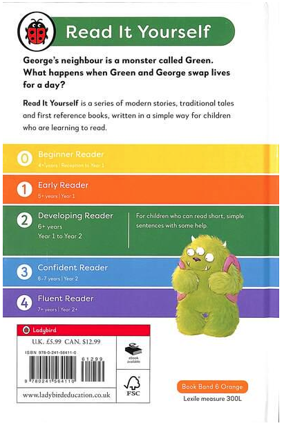George is an ordinary boy with an ordinary family who like eating fish and chips. Green is a monster with a monster family who love tucking into green slime for dinner. What on earth will happen when George and Green swap lives for a day?