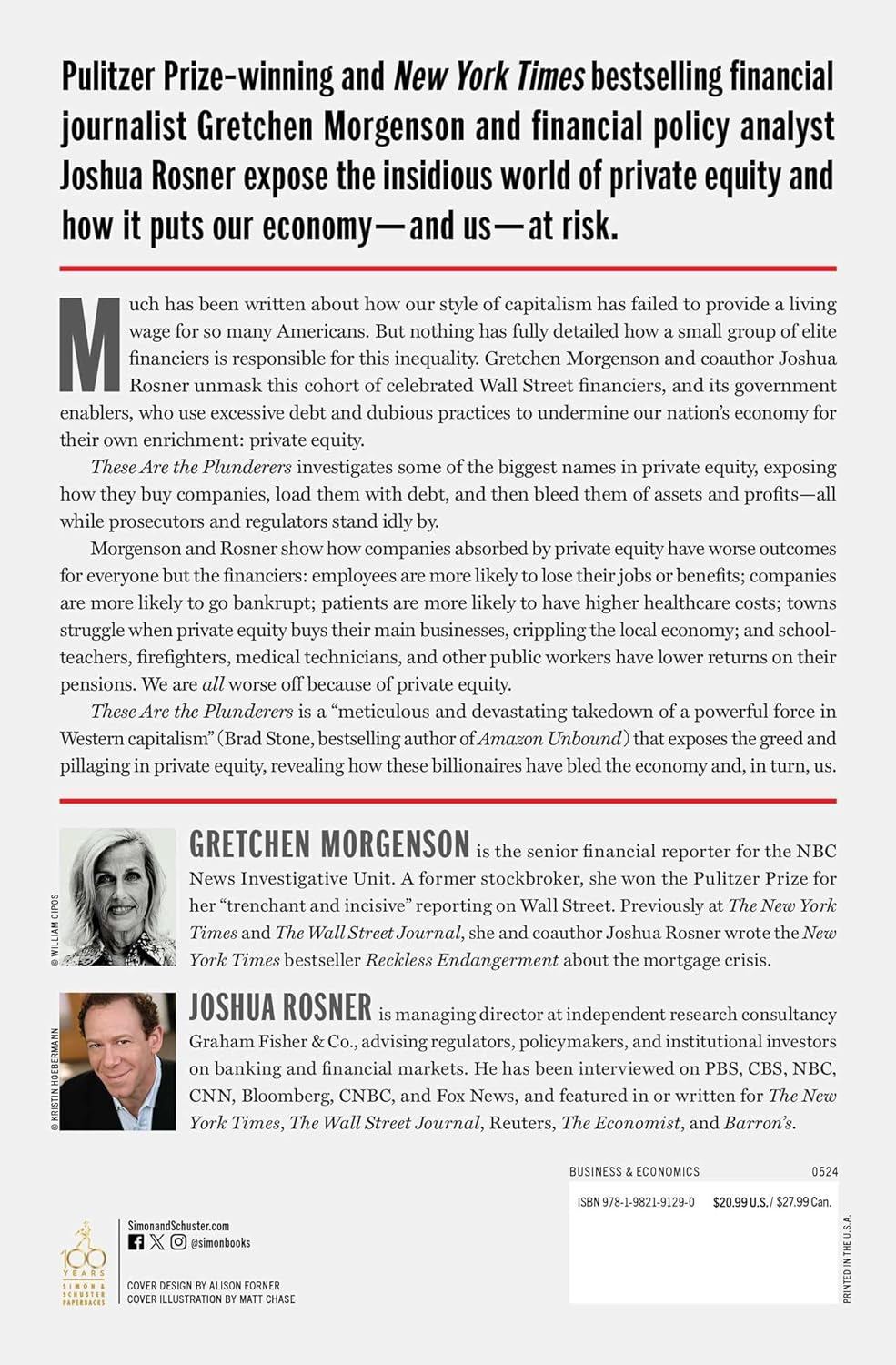 These Are the Plunderers traces the thirty-year history of corporate takeovers in America and private equity’s increasing dominance. Morgenson and Rosner investigate some of the biggest names in private equity, exposing how they buy companies, load them with debt, and then bleed them of assets and profits. All while prosecutors and regulators stand idly by.