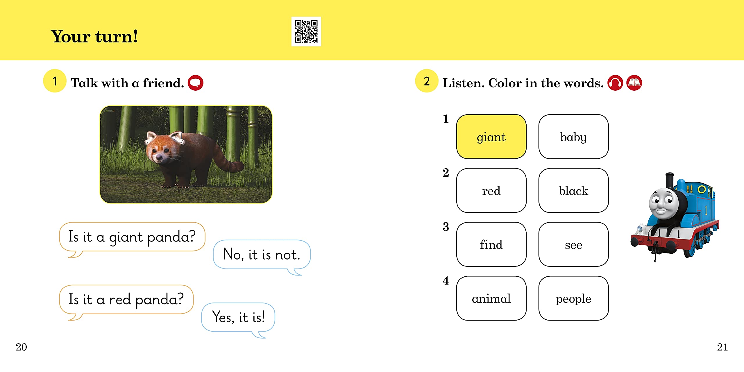 Thomas and the Giant Pandas, a Beginner level Reader, helps children to learn and practice their first words in English. It introduces everyday phrases and focuses on vocabulary that young children can use in daily life. Simple text and repetition support understanding, and speaking and listening activities develop confidence.