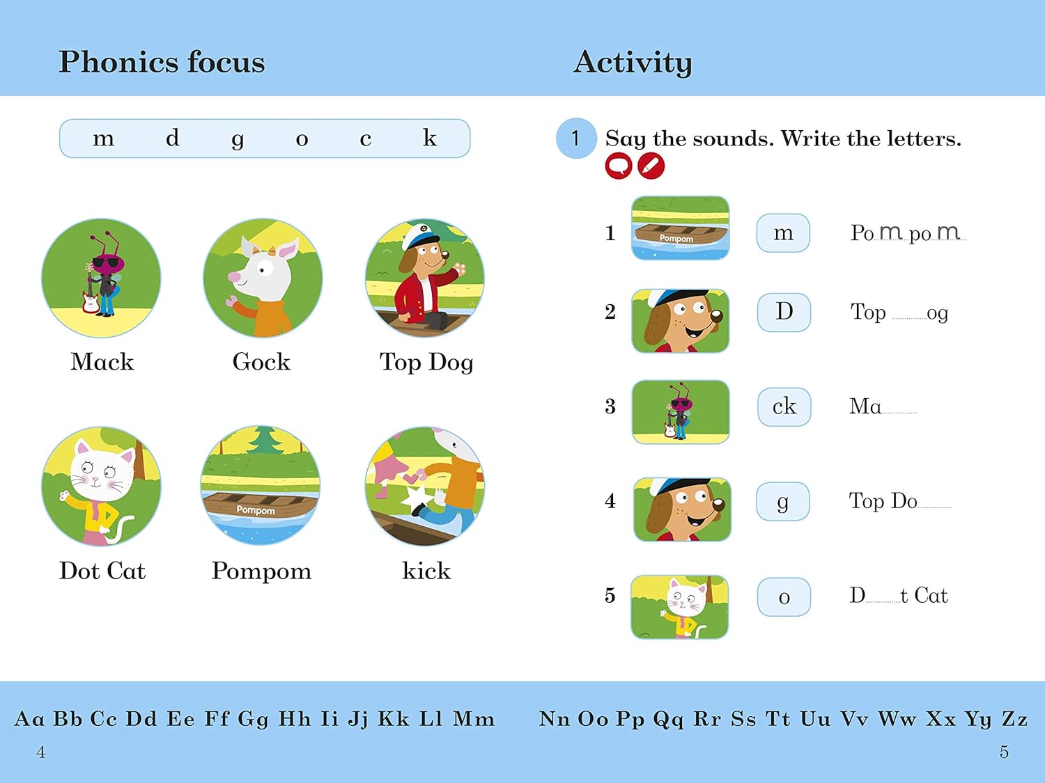 , a Starter level Reader, introduces phonics and sight words. Each book contains two versions of the story: the first with single words focusing on phonics, with the emphasis on letter recognition and pronunciation; the second with short sentences introducing sight words.