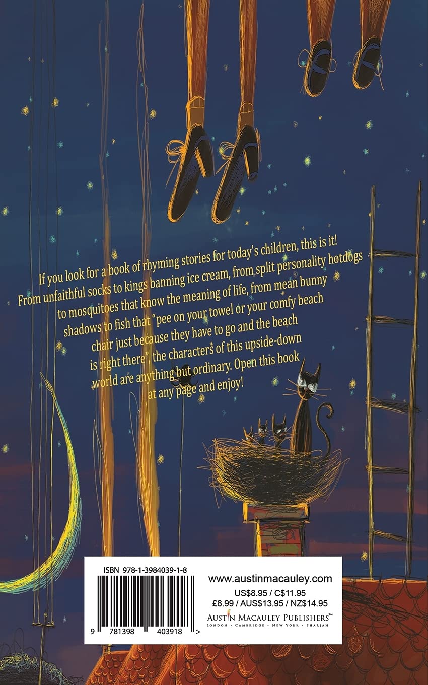 If you look for a book of rhyming stories for todays children, this is it! From unfaithful socks to kings banning ice cream, from split personality hotdogs to mosquitoes that know the meaning of life, from mean bunny shadows to fish that pee on your towel or your comfy beach chair just because they have to go and the beach is right there, the characters of this upside\-down world are anything but ordinary. Open this book at any page and enjoy!