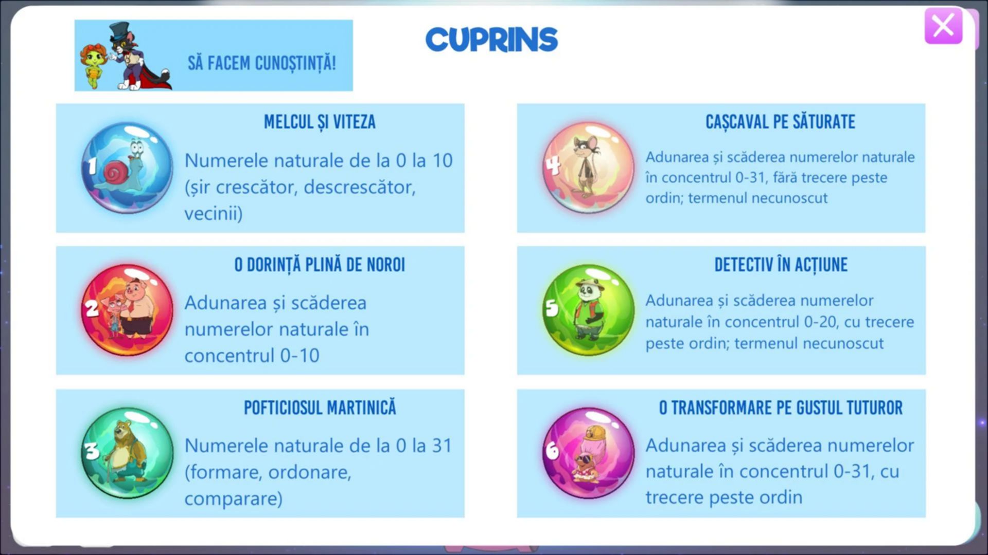 Aplicația conține 24 de jocuri educative și distractive, 31 de animații, 100 de fișe de lucru și 7 teste de evaluare (fișele de lucru și testele sunt disponibile doar pentru aplicația de Windows). Cu ajutorul lor, copilul își verifică, într-un mod plăcut și distractiv, toate cunoștințele de matematică.