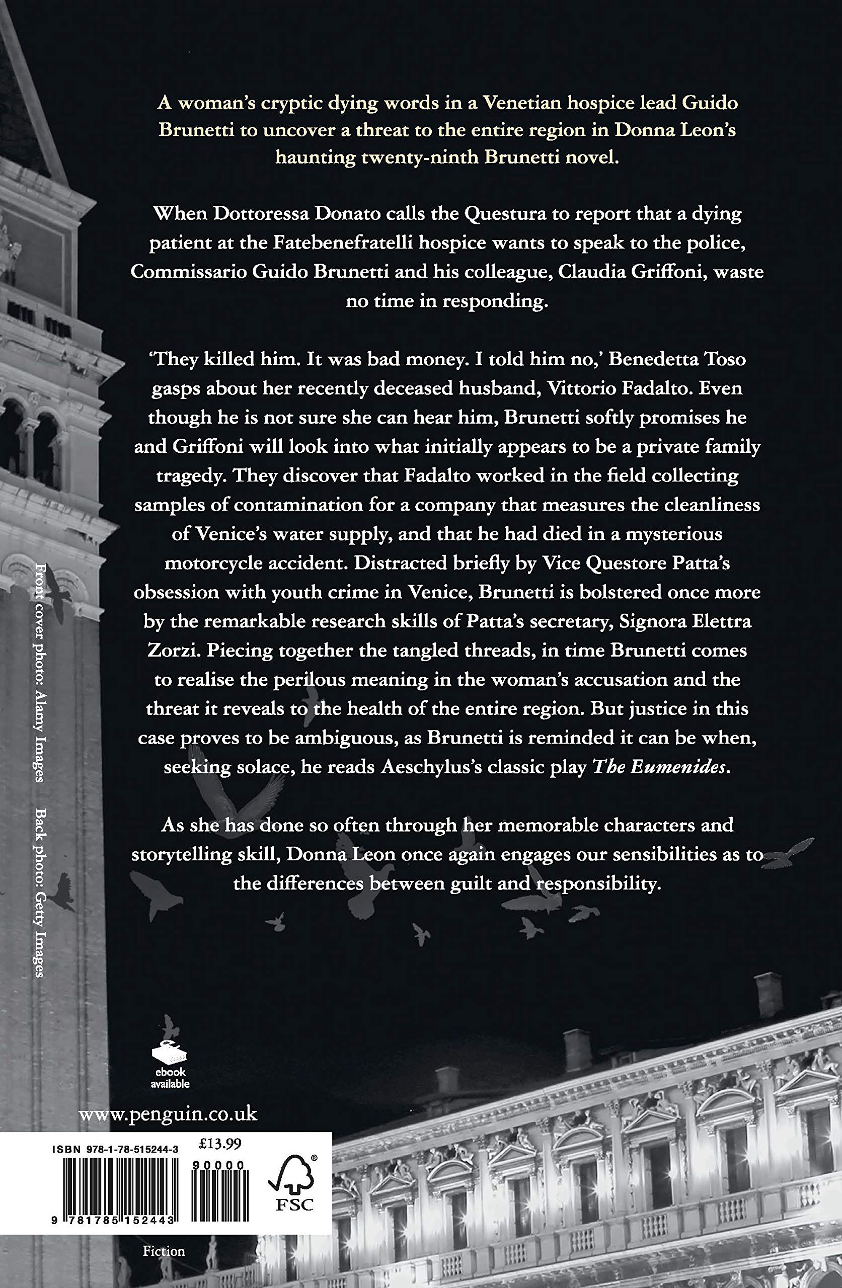 ‘They killed him. It was bad money. I told him no’, Benedetta Toso gasps the words about her recently-deceased husband, Vittorio Fadalto. Even though he is not sure she can hear him Brunetti softly promises he and Griffoni will look into what initially appears to be a private family tragedy. They discover that Fadalto worked in the field collecting samples of contamination for a company that measures the cleanliness of Venice’s water supply and that he had died in a mysterious motorcycle accident. Distracted briefly by Vice Questore Patta’s obsession with youth crime in Venice, Brunetti is bolstered once more by the remarkable research skills of Patta’s secretary, Signora Elettra Zorzi. Piecing together the tangled threads, in time Brunetti comes to realize the perilous meaning in the woman’s accusation and the threat it reveals to the health of the entire region. But justice in this case proves to be ambiguous, as Brunetti is reminded it can be when, seeking solace, he reads Aeschylus’s classic play The Eumenides.