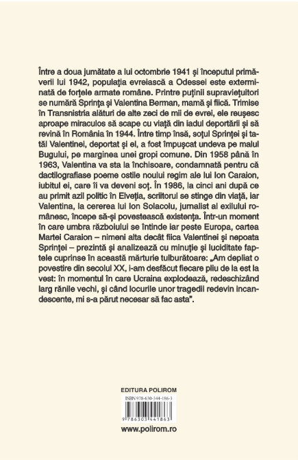Într-un moment în care umbra războiului se întinde iar peste Europa, cartea Martei Caraion – nimeni alta decât fiica Valentinei și nepoata Sprinței – prezintă și analizează cu minuție și luciditate faptele cuprinse în această mărturie tulburătoare: