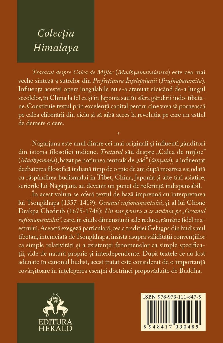 Nagarjuna este unul dintre cei mai originali si influenti ganditori din istoria filosofiei indiene. Tratatul sau despre „Calea de mijloc” (Madhyamaka), bazat pe notiunea centrala de „vid” (sūnyata), a influentat dezbaterea filosofica indiana timp de o mie de ani dupa moartea sa; odata cu raspandirea budismului in Tibet, China, Japonia si alte tari asiatice, scrierile lui Nagarjuna au devenit un punct de referinta indispensabil. In acest volum se ofera textul de baza impreuna cu interpretarea lui Tsongkhapa (1357-1419): Oceanul rationamentului, si al lui Chone Drakpa Chedrub (1675-1748): Un vas pentru a te avanta pe „Oceanul rationamentului”, care, in ciuda dimensiunii sale reduse, ramane fidel maestrului. Aceasta exegeza particulara, cea a traditiei Gelugpa din budismul tibetan, intemeiata de Tsongkhapa, insista asupra validitatii conventiilor ca simple relativitati si a existentei fenomenelor ca simple specificatii, vide de natura proprie si interdependente. Dupa textele ce au fost adunate in canonul budist, acest tratat este considerat de o importanta covarsitoare in intelegerea esentei doctrinei propovaduite de Buddha.