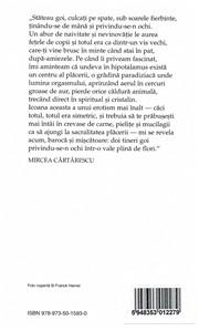 "Stateau goi, culcati pe spate, sub soarele fierbinte, tinandu-se de mana si privindu-se in ochi. Un abur de naivitate si nevinovatie le aurea fetele de copii si totul era ca dintr-un vis vechi, care-ti vine brusc in minte cand stai in pat, dupa-amiezele. Pe cand ii priveam fascinat, imi aminteam ca undeva in hipotalamus exista un centru al placerii, o gradina paradiziaca unde lumina orgasmului, aprinzand aerul in cercuri groase de aur, pierde orice caldura animala, trecand direct in spiritual si cristalin. Icoana aceasta a unui erotism mai inalt -- caci totul, totul era simetric, si trebuia sa te prabusesti mai intai in crevase de carne, pielite si mucilagii ca sa ajungi la sacralitatea placerii -- mi se revela acum, baroca si miscatoare: doi tineri goi privindu-se-n ochi intr-o vale plina de flori." (Mircea Cartarescu)