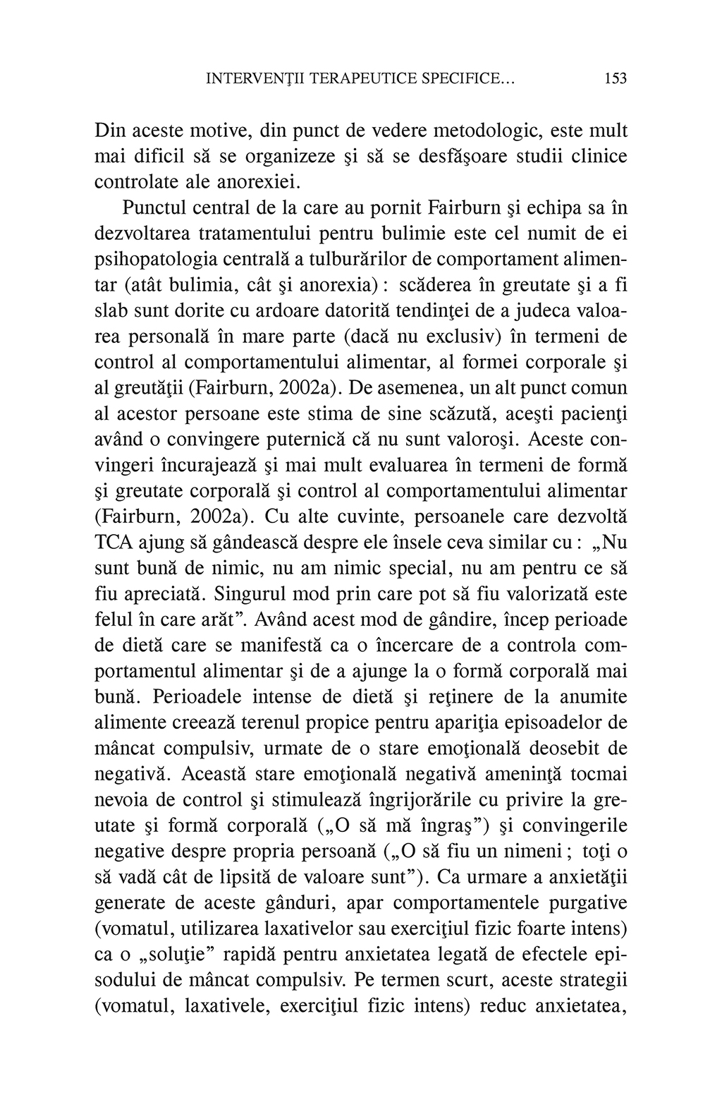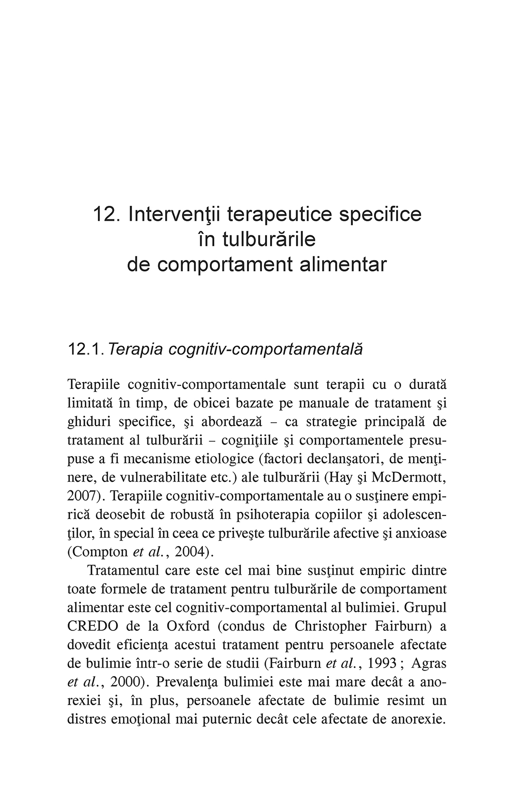 "Obiectivul cartii este de a umple golurile de informatie din literatura de specialitate disponibila in limba romana prin abordarea terapeutica a tulburarilor de comportament alimentar la copii si adolescenti. Tratamentul acestor tulburari, in mod obisnuit, presupune mobilizarea unei intregi echipe de specialisti care poate include, in afara de psihologul clinician, un medic pediatru, un internist (eventual endocrinolog sau cardiolog), un psihiatru, un dietetician si diferiti terapeuti, in functie de caz. Volumul se adreseaza tuturor acestor categorii de specialisti interesati de perspectiva psihologica a acestor tulburari si, in egala masura, parintilor si studentilor la psihologie si medicina. Parintii vor avea ocazia de a intelege rolul activ pe care il au de indeplinit in lupta cu tulburarea de alimentatie, iar cartea le va pune la dispozitie recomandari privind caile de actiune adecvate pe care ar putea sa le urmeze in cazul fiecarei tulburari in parte.” (Ion Dafinoiu)