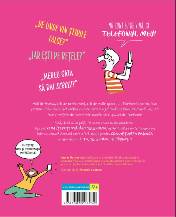De ce telefonul mult aşteptat îi poate capta copilului toată atenţia, generând nu numai tensiuni în familie, ci şi probleme de socializare sau chiar de sănătate? Ce se întâmplă în creierul adolescenților când „stau numai pe telefon”? Cum se instalează dependenţa de reţelele sociale? Uite ce face telefonul meu! este un ghid indispensabil, amuzant şi plin de informaţii importante, destinat copiilor și adolescenților care locuiesc și în lumea telefoanelor mobile și a rețelelor sociale. Cartea îi ajută să înțeleagă cum să-și controleze noul „prieten” digital, evitând capcane cum ar fi dependența, expunerea la fake news, hărţuirea online şi alte forme de violenţă digitală. Prin informațiile, jocurile, testele şi ilustraţiile prietenoase, copiii și adolescenții pot învăța cum să-și gestioneze timpul online, cum să navigheze prin universul complex al reţelelor sociale şi să respecte regulile de siguranţă. Odată formate reflexele corecte, ei vor şti ce înseamnă un echilibru sănătos între lumea virtuală și viața reală şi îşi vor putea folosi telefonul în mod creativ, ingenios şi responsabil.