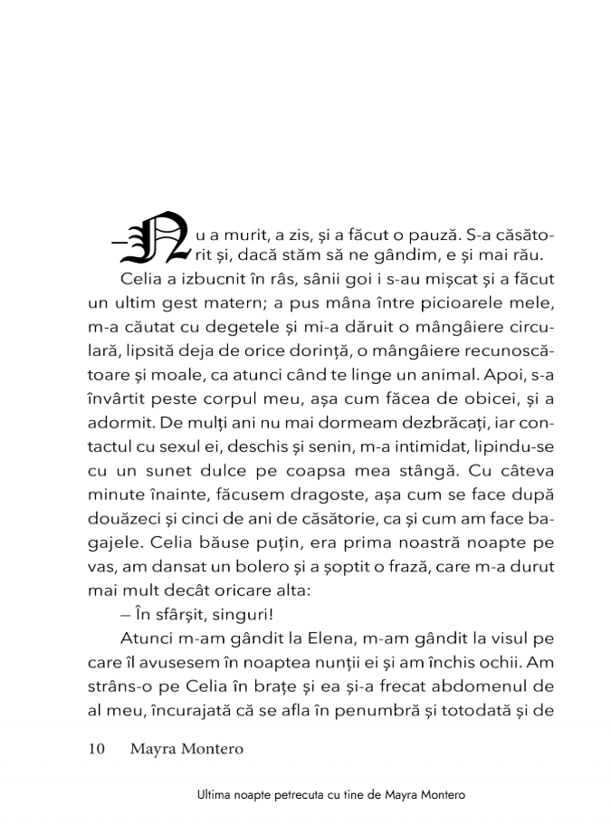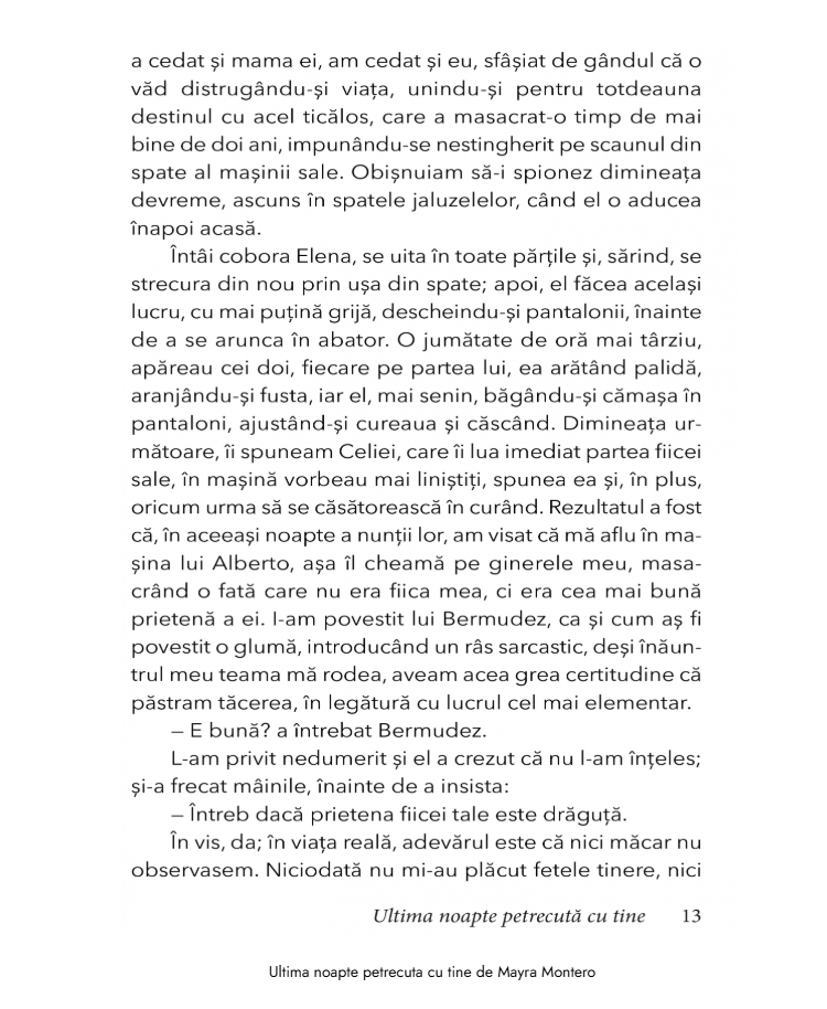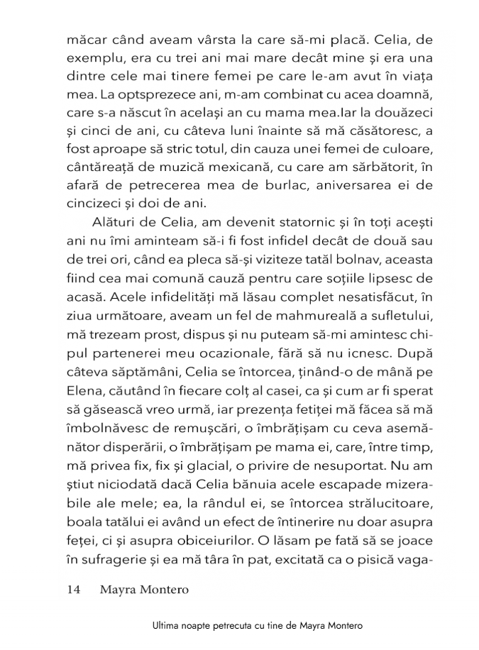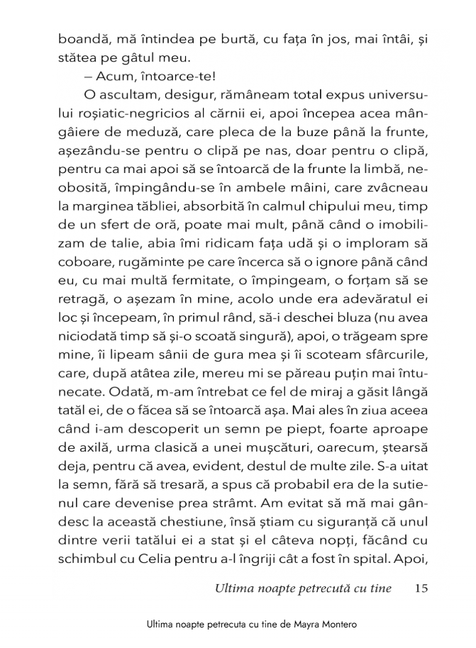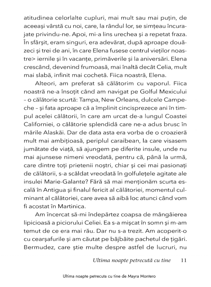 Incetul cu incetul, pe de o parte, cititorul se intoarce in trecutul aparent neremarcabil si modest al cuplului si, la marginea amintirilor lor, in acea alta viata, infinit mai bogata si mai sugestiva, in care cuplurile ascund, de obicei, intensul, obsesiv sau pasionate secrete de nespus, si mai presus de toate nemarturisite. Pe de alta parte, in decorul placut al vasului de croaziera, in care viata trece ca intr-un vis de celofan, cititorul descopera, impreuna cu Celia si Fernando, ca aceleasi amintiri, in contact cu senzualitatea naturala a mediului, sunt — hranind, contaminand — fanteziile erotice de mult dorite si continute si care asupra lor, datorita lor se vor implini in experiente incrucisate si impletite, cu toata furia, cu toata grosolania, acum fara posibila retinere, pana la exorcismul eliberator, pana la sacrificiul final.