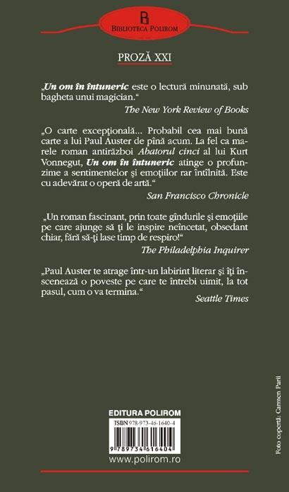 „O carte exceptionala... Probabil cea mai buna carte a lui Paul Auster de pina acum. La fel ca marele roman antirazboi Abatorul cinci al lui Kurt Vonnegut, Un om in intuneric atinge o profunzime a sentimentelor si emotiilor rar intilnita. Este cu adevarat o opera de arta.” (San Francisco Chronicle)