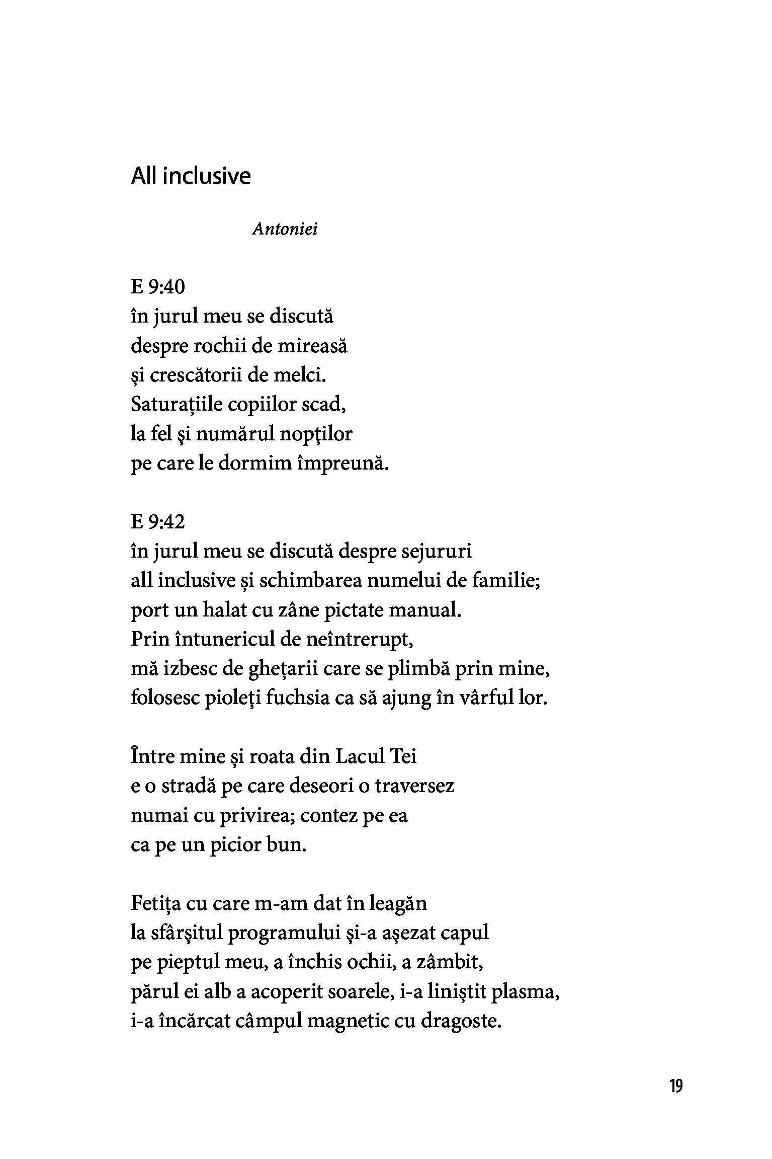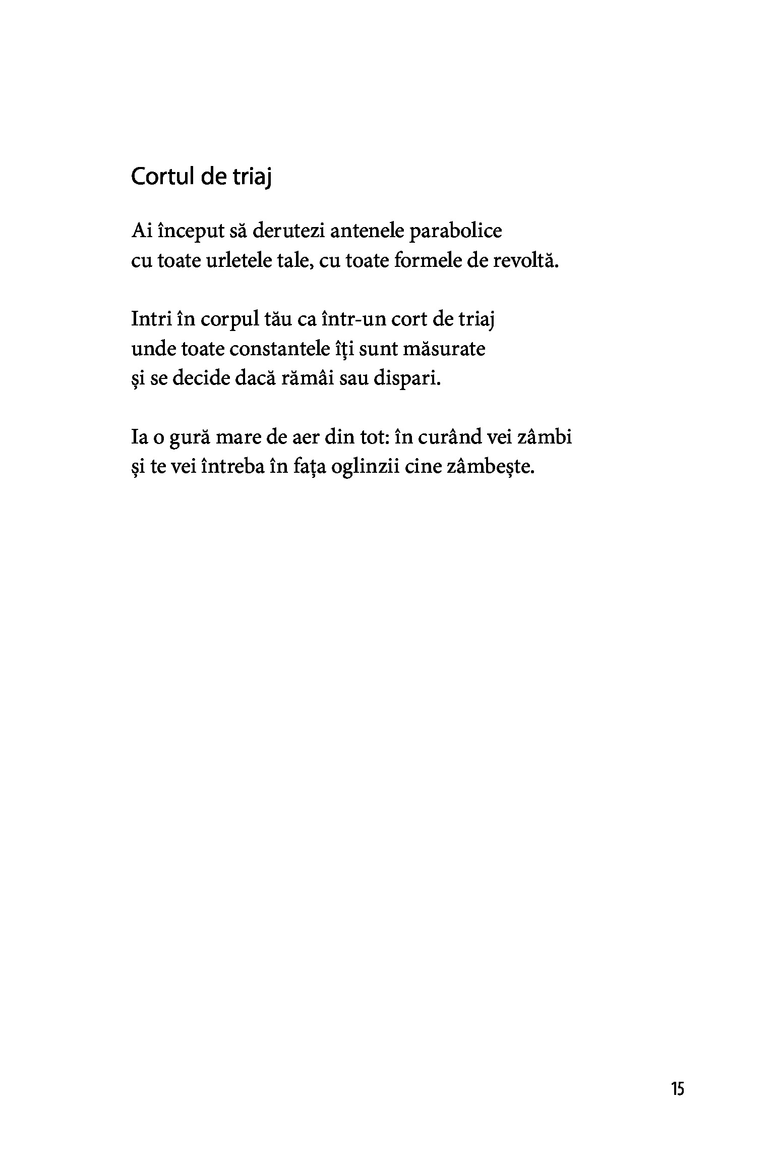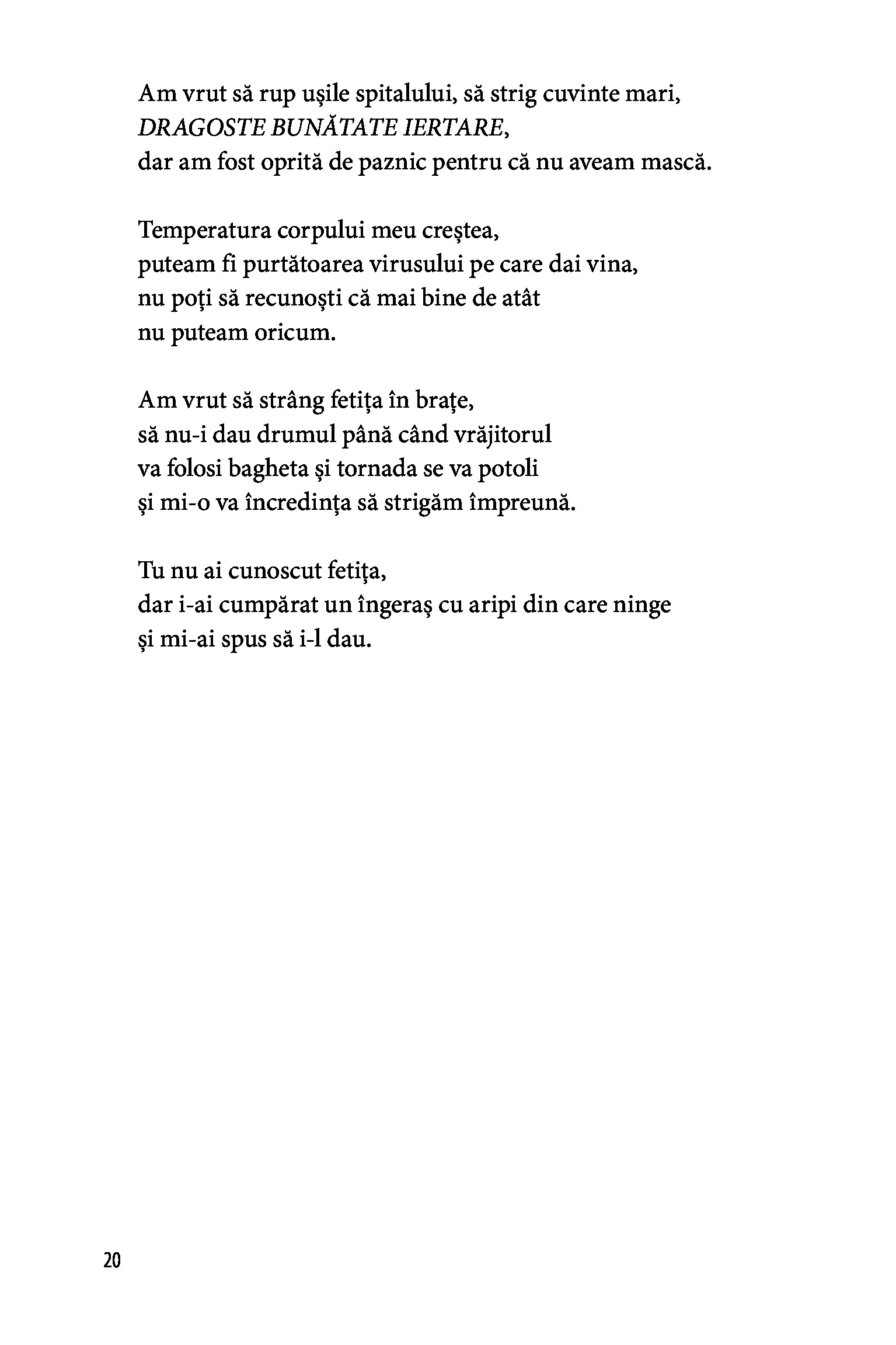 Fiecare poem al ei e un manifest radical şi totodată tandru, dar şi un experiment la limită: survolează apele şi coboară în subteran şi, asemenea unei celule, poate lua forme infinite. Respiră acea muzică despre care vorbea Angela Marinescu – «muzica din adâncuri, spartă, care ţine şi de lume, şi de univers, şi de stele, dar şi de pămînt, de sânge şi de suferinţă.»