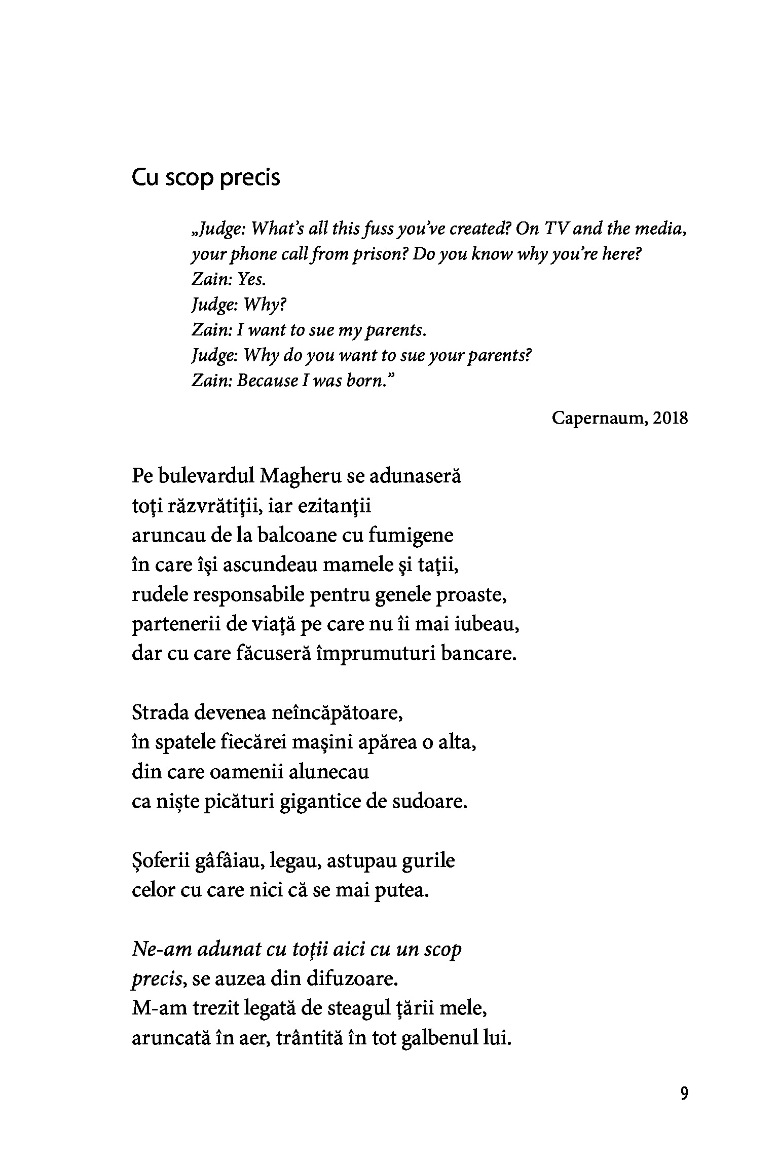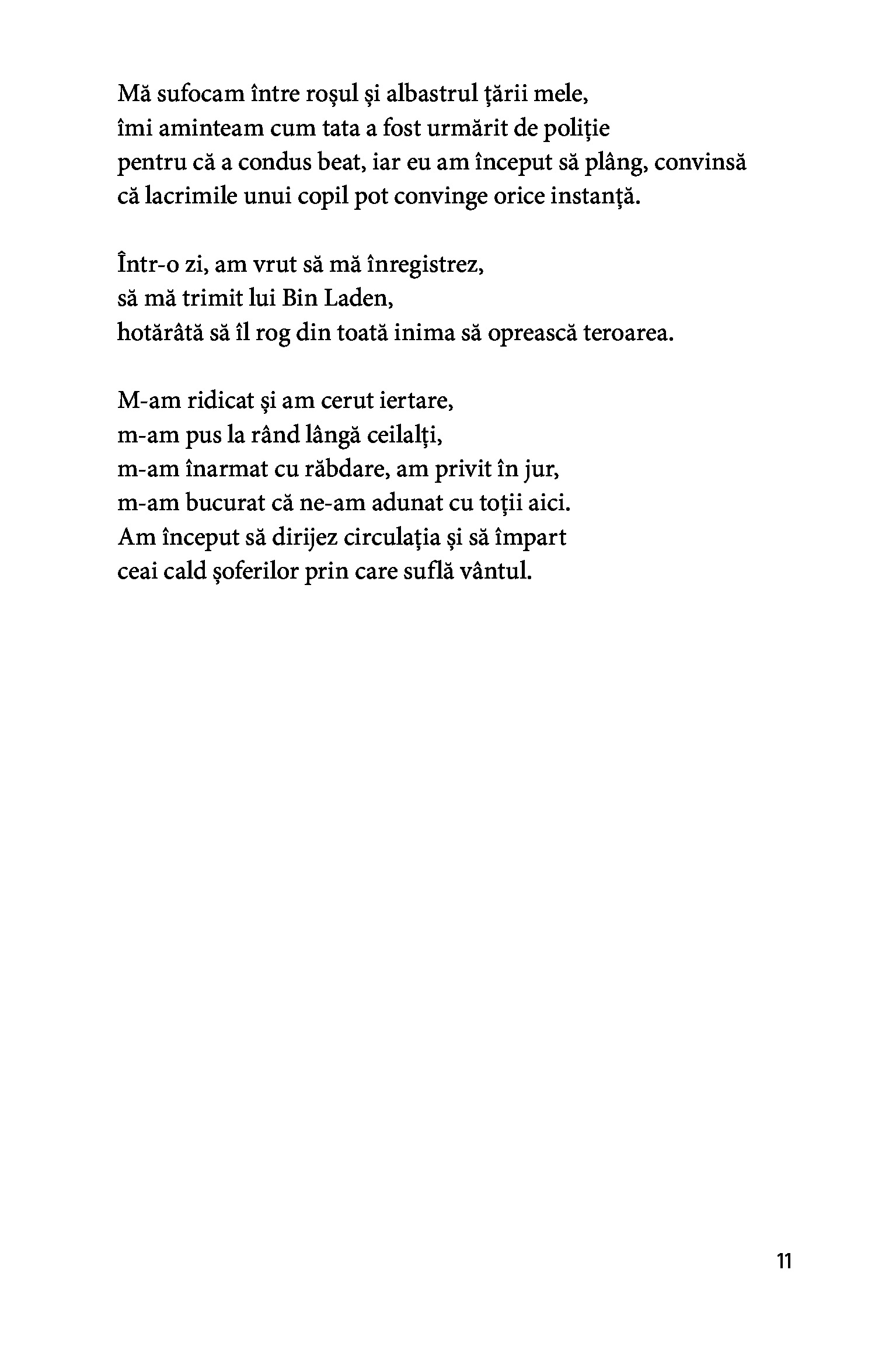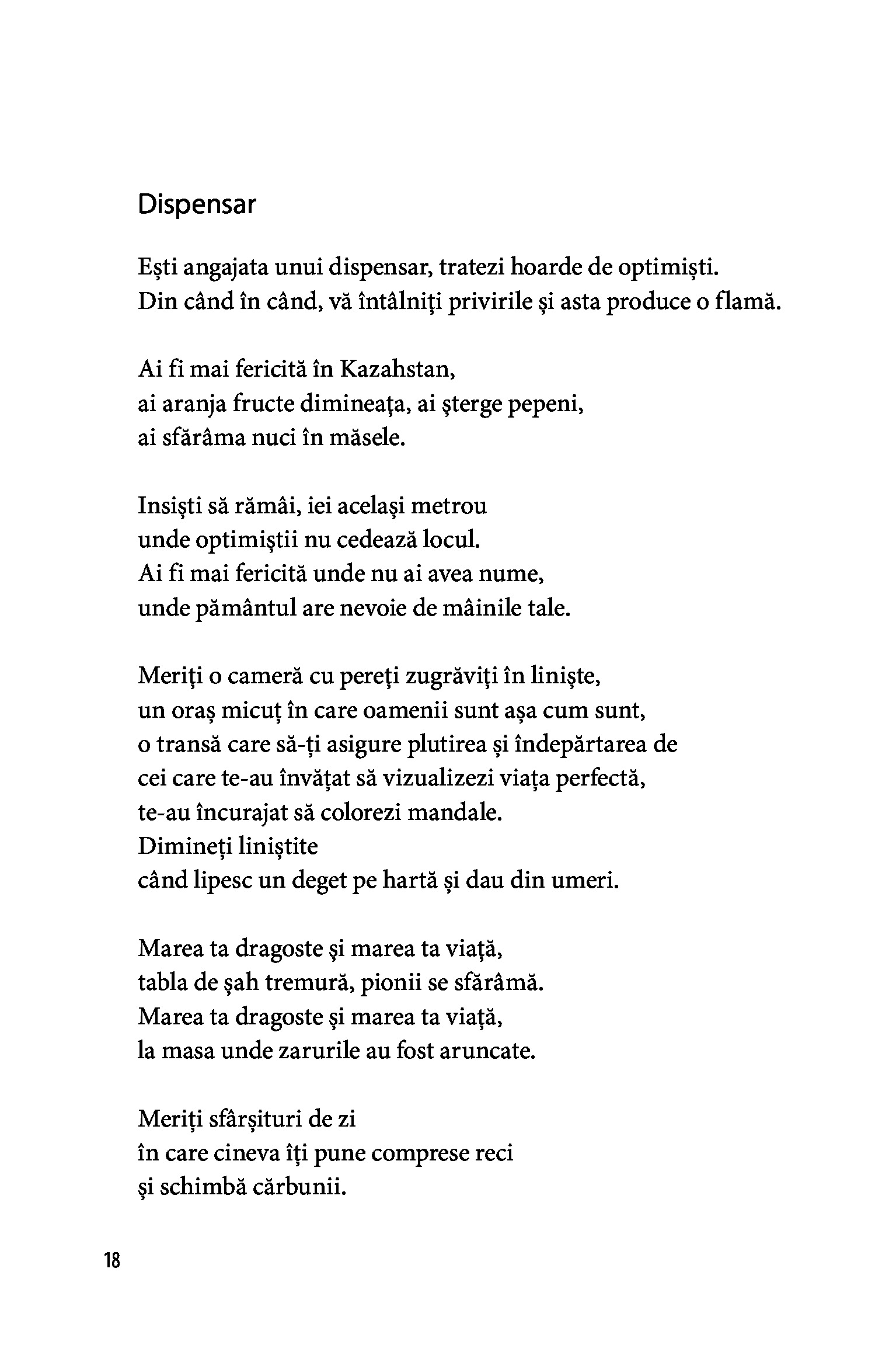 Fiecare poem al ei e un manifest radical şi totodată tandru, dar şi un experiment la limită: survolează apele şi coboară în subteran şi, asemenea unei celule, poate lua forme infinite. Respiră acea muzică despre care vorbea Angela Marinescu – «muzica din adâncuri, spartă, care ţine şi de lume, şi de univers, şi de stele, dar şi de pămînt, de sânge şi de suferinţă.»