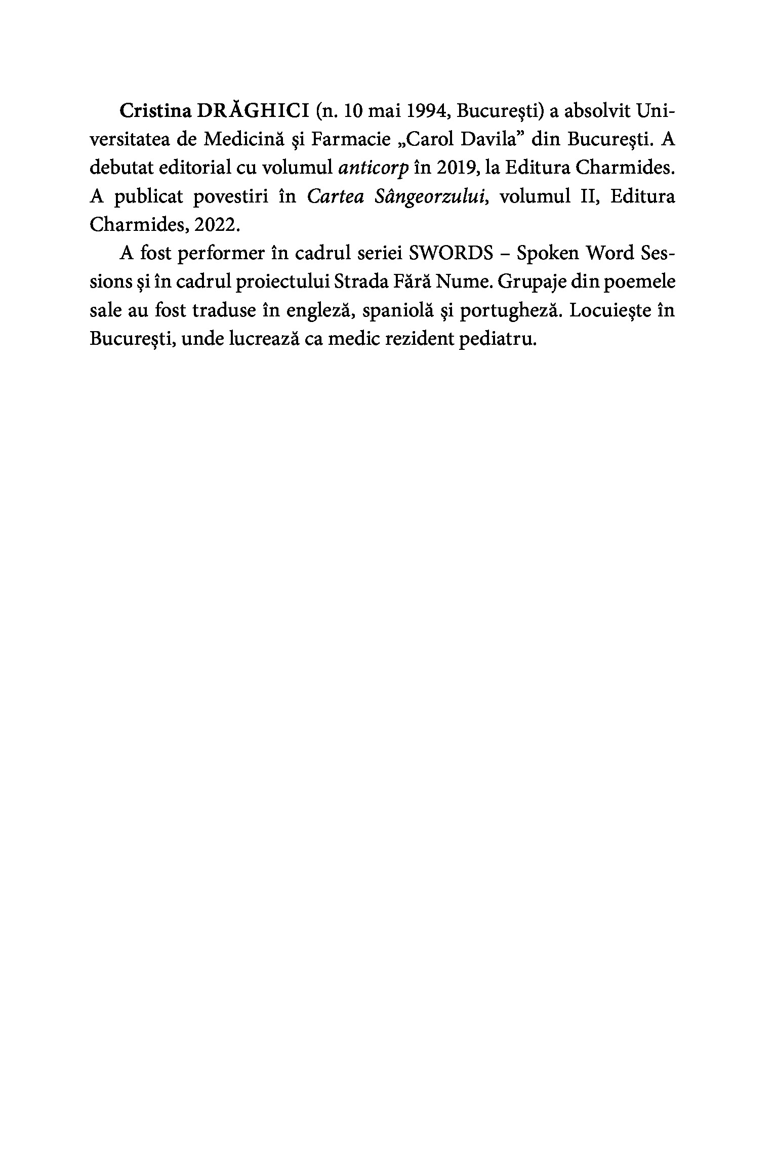 „Cristina Drăghici iși oficiază poezia ca o zeiţă pe deplin sigură de puterea ei de a fi în lume. Ochiul ei imens, care se deschide până la capăt, cuprinde şi înregistrează totul: o inimă mică, găsită în lăzile de gunoi şi ţinută cu grijă în palme, fiinţa pe care nu a născut-o nimeni şi care şi-a generat singură placenta, fata care a privit cum visul, ca o cobră regală, a găsit jugulara, ţesătoarea de traumă, femeia-citoplasmă care captează lumina.