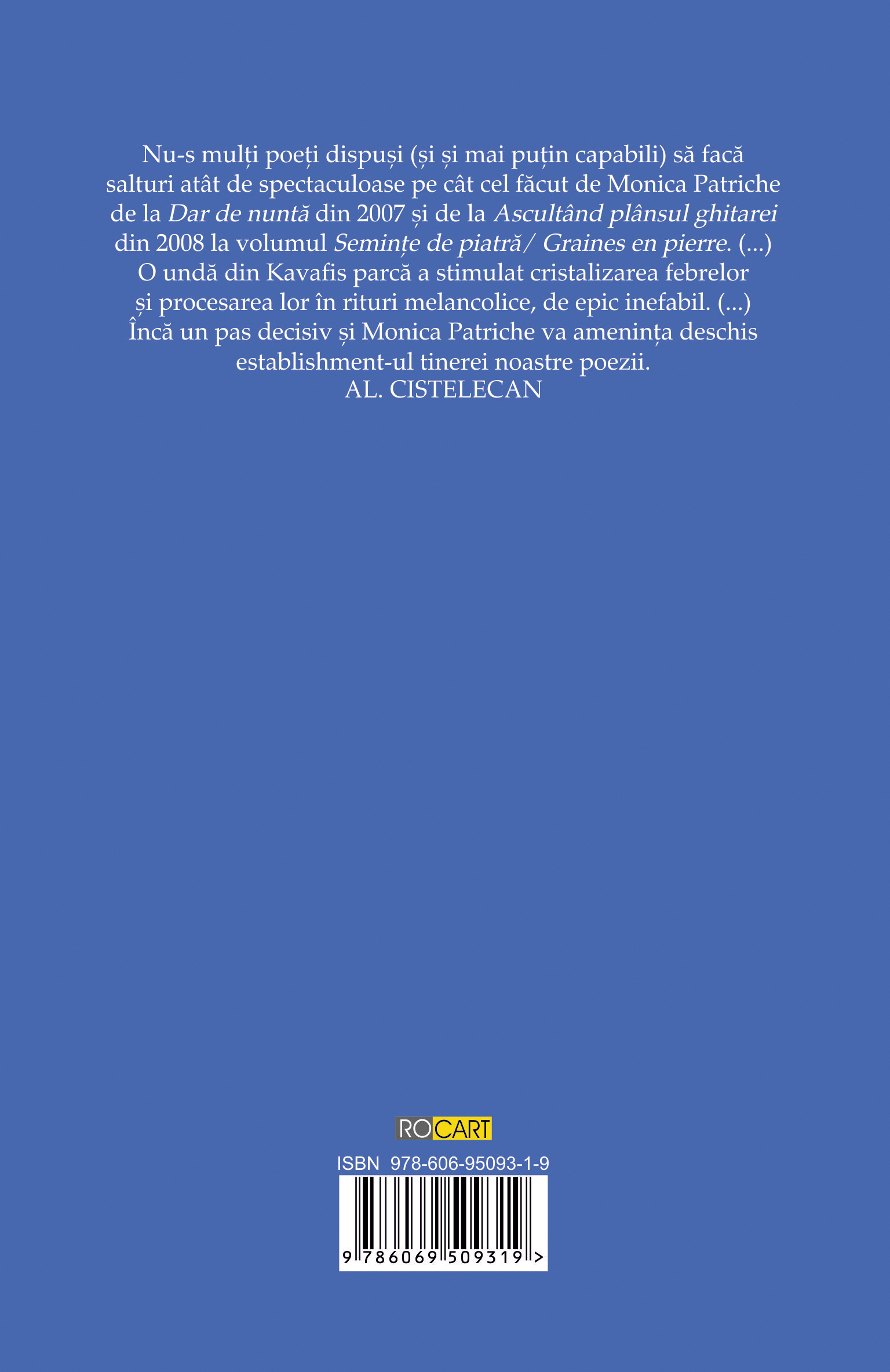 Nu-s mulţi poeţi dispuşi (şi şi mai puţin capabili) să facă salturi atât de spectaculoase pe cât cel făcut de Monica Patriche de la Dar de nuntă din 2007 şi de la Ascultând plânsul ghitarei din 2008 la volumul Seminţe de piatră/ Graines en pierre. (…) O undă din Kavafis parcă a stimulat cristalizarea febrelor şi procesarea lor în rituri melancolice, de epic inefabil. (…) Încă un pas decisiv şi Monica Patriche va ameninţa deschis establishment-ul tinerei noastre poezii.