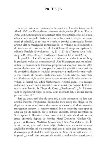 Sunt convins că noua ediție, cu programul și intențiile ei de redare a marii opere într-un registru lingvistic autentic, natural și firesc – cum a fost și gândită și jucată în vremea lui –, poate resuscita interesul și pasiunea pentru opera celui mai mare dramaturg al literaturii universale. (…) Toate traducerile sunt noi, la efortul și intenția editorului de a primeni limba în care apar textile lui W.S. alăturându-se câțiva scriitori, poeți și eseiști, care au reușit să țină sus o ștachetă a prospețimii și autenticității unei limbi române vii și colorate, precum engleza vorbită acum câteva secole. Unele texte apar pentru prima dată, dar toate beneficiază de studii critice aplicate, erudite și bine articulate sub aspect documentar.