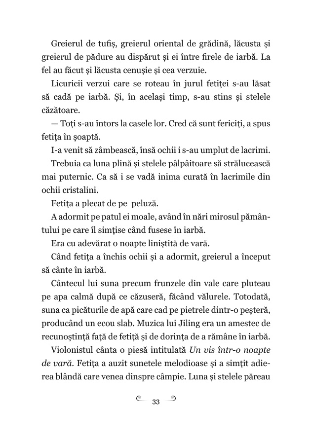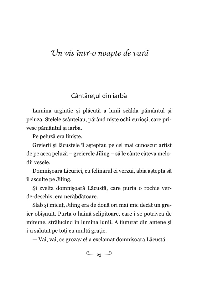 Un vis într-o noapte de vară este o colecție de cincisprezece povești pline de imaginație, cu personaje simpatice, ilustrații sugestive, cu morală ascunsă subtil printre cuvinte simple, care dezvoltă gândirea copiilor și îi ajută să înțeleagă mai bine noțiuni legate de bine și de rău, antrenându-le abilitatea de a vizualiza întâmplările citite. Printre personajele care vor deveni, cu siguranță, noii prieteni ai copiilor se numără: talentatul greier Jiling, care o desfată cu cântecele sale pe fetița care l-a salvat, Micuța Pasăre Verde, ajutată de Micul Lup să ajungă înapoi la mama ei, Șoricelul, care s-a împrietenit cu o steluță, domnul Broscoi, care îi trimitea scrisori fratelui său, sperând ca într-o zi să fie din nou împreună, Iepurica Albă, a cărei cea mai mare dorință era să se dea într-un leagăn, păianjenul veninos care avea un secret și era gata să își dea viața pentru el, balena albastră care vrea să se răzbune pe pescari, Lupul Dudu, care în fiecare noapte cu lună plină se poate transforma într-un prinț care cântă – și alții.