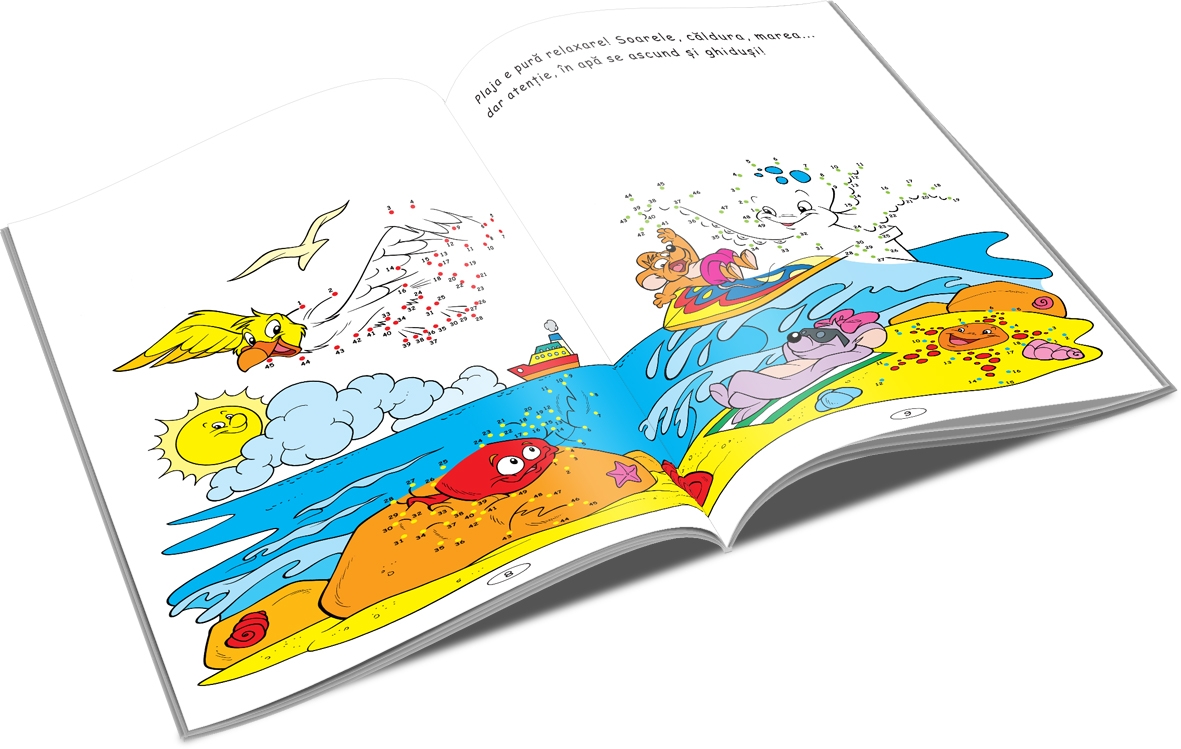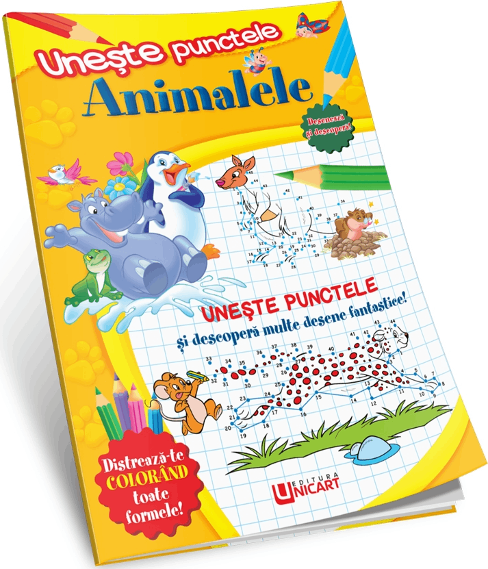 Unește punctele și descoperă multe desene fantastice! Te poți distra colorând formele cu creioane și carioci.