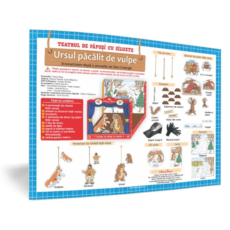 Produsul nu contine cutia cadru (scena), pentru a putea fi folosit este necesara achizitionarea unui teatru de papusi cu siluete integral.