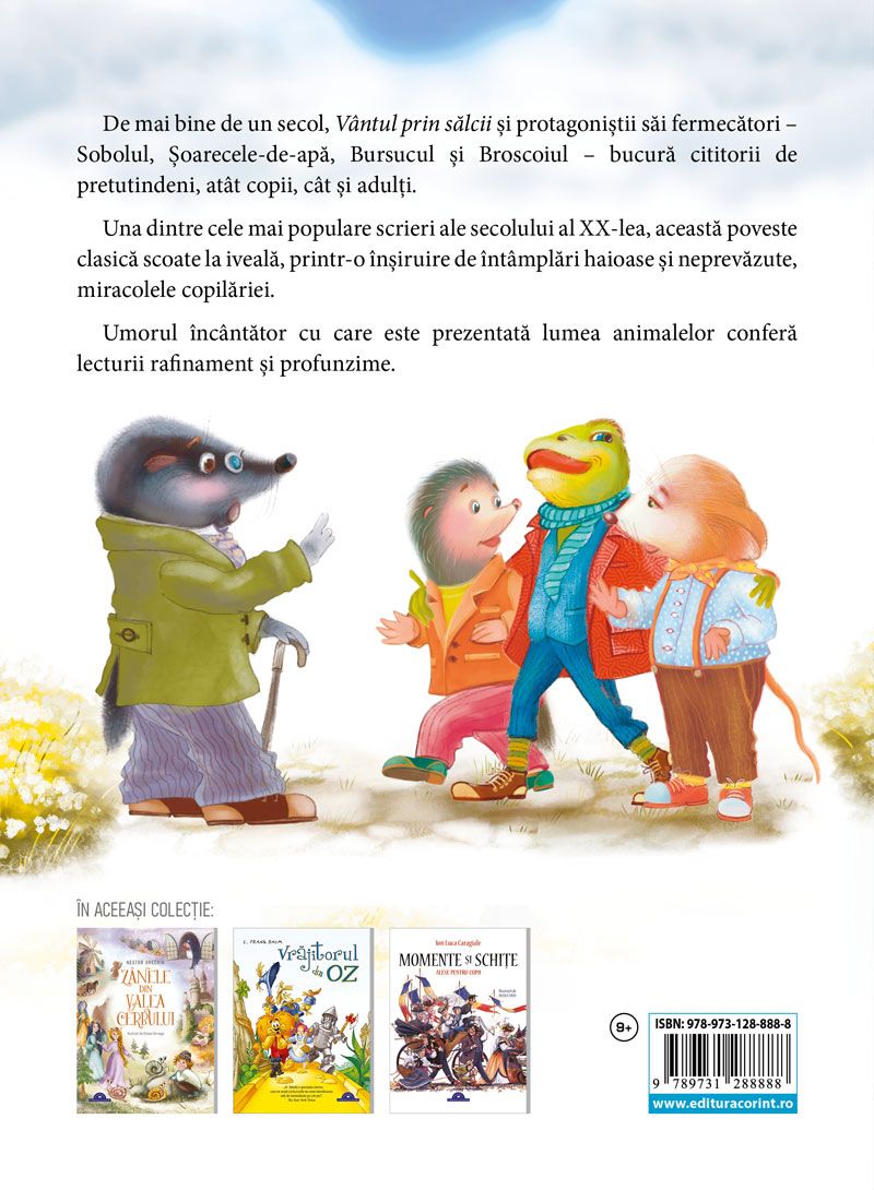 Pentru mai bine de un secol, Vântul prin sălcii și protagoniștii săi fermecători – timidul, dar aventurierul Sobol, istețul și curajosul Șoarece‑de‑apă, ursuzul și devotatul Bursuc, nesăbuitul și înfumuratul Broscoi – au bucurat mințile a mai multe generații de copii. Indiferent dacă cei patru prieteni pornesc într-o aventură incitantă sau se relaxează, pur și simplu, lângă râu, poveștile lor au puterea de a surprinde și a cuceri.