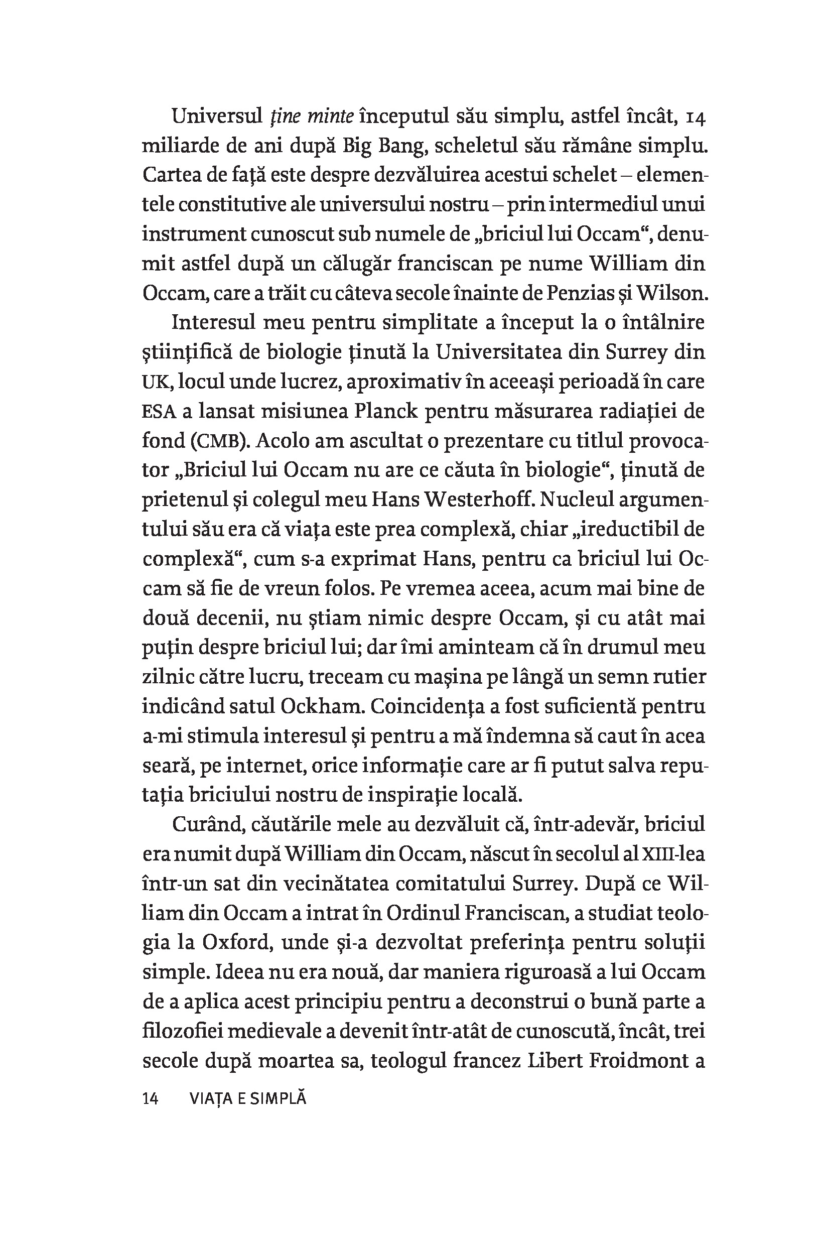 Dar poate cel mai fertil aspect al acestui frumos excurs în istoria unei idei este ipoteza pe care o lansează, anume aceea că simplitatea lui Occam, principiu metodologic aflat la baza reprezentării moderne a lumii, ar fi totodată modul de operare al vieții înseși.