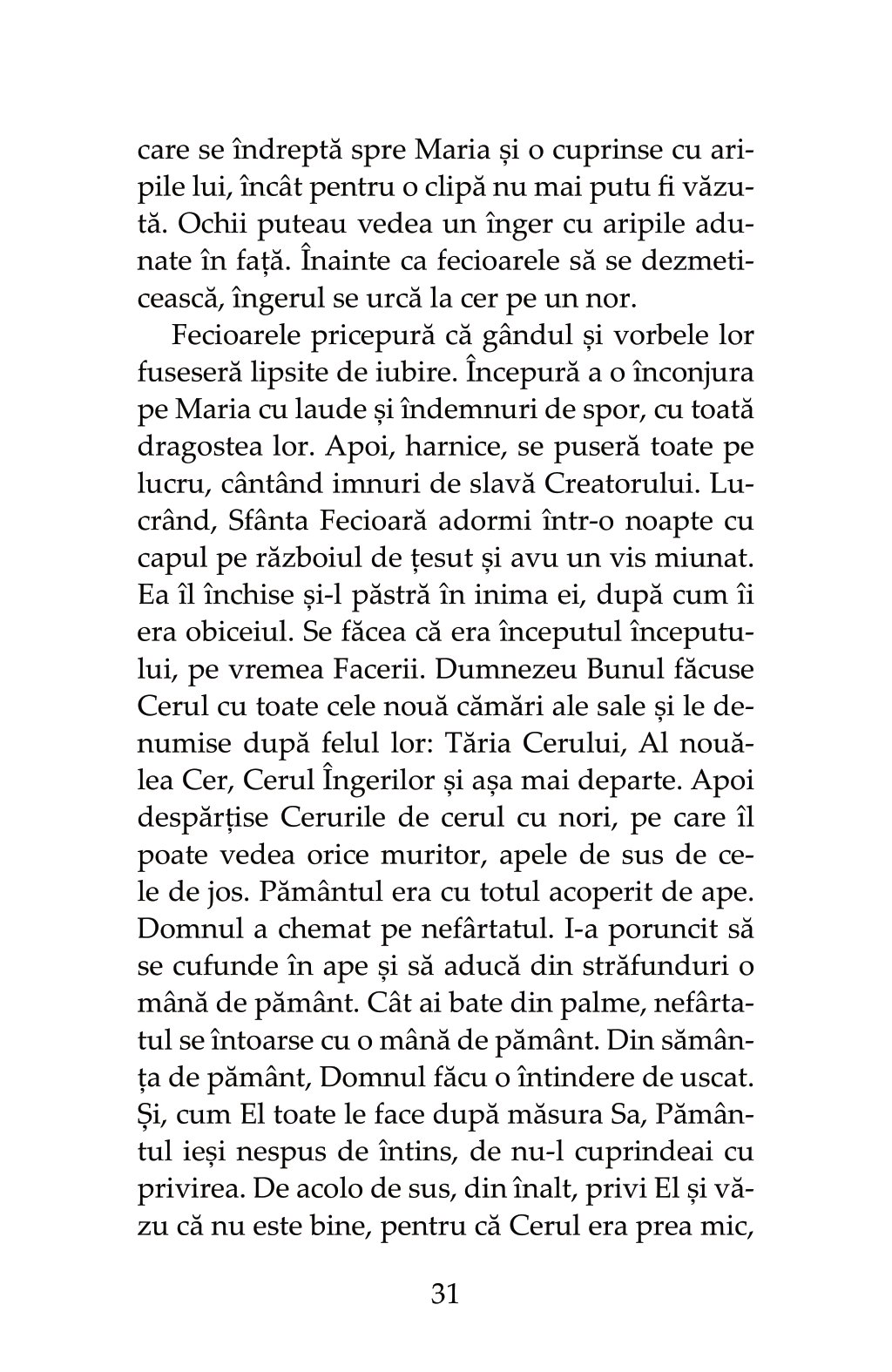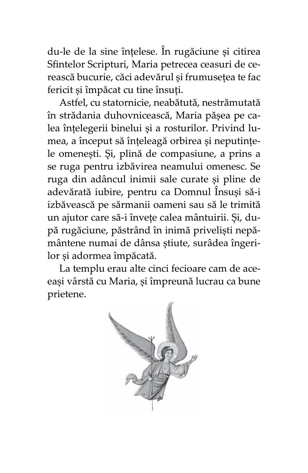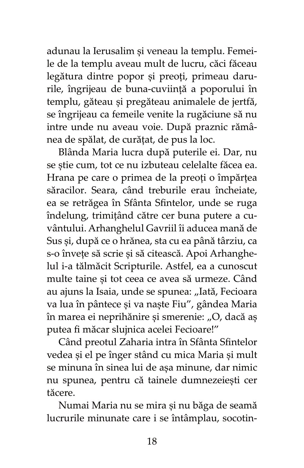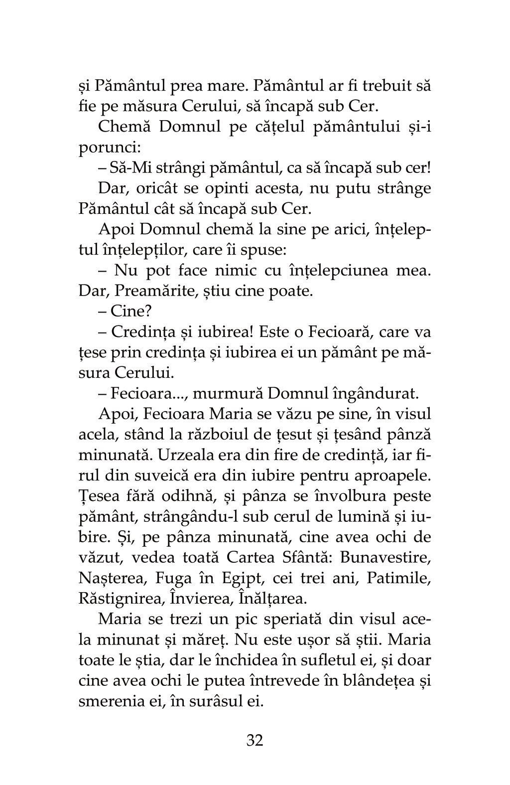 Cartea de față ne propune câteva povestiri inspirate de poveștile din bătrâni, descoperindu-ne, pas cu pas, gingășia nesfârșită a vieții Maicii Domnului. Este un răstimp de care avem nevoie într-o lume tot mai lipsită de răbdare, dar grabnică în a oferi imaginației noastre lucuri mai puțin folositoare.