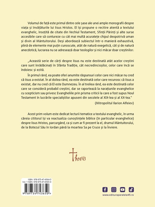 Acest prim volum este dedicat lecturii tematice a textului evan ghelic, în urma căreia cititorul își va reactualiza cunoștințele biblice (în particular evanghelice) despre Iisus Hristos, parcurgând, ca și cum ar fi prezent la el, drumul Mântuitorului, de la Botezul Său în Iordan până la moartea Sa pe Cruce și la Înviere.