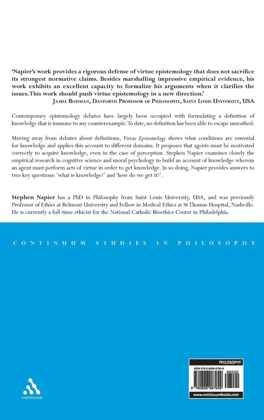 Combining conceptual analysis with well established empirical evidence, this is an important new book in analytical epistemology.Contemporary epistemology debates have largely been occupied with formulating a definition of knowledge that is immune to any counterexample. To date, no definition has been able to escape unscathed.Moving away from debates about definitions, "Virtue Epistemology" shows what conditions are essential for knowledge and applies this account to different domains. It proposes that agents must be motivated correctly to acquire knowledge, even in the case of perception.Stephen Napier examines closely the empirical research in cognitive science and moral psychology to build an account of knowledge wherein an agent must perform acts of virtue in order to get knowledge. In so doing, Napier provides answers to two key questions: 'what is knowledge?' and 'how do we get it?'