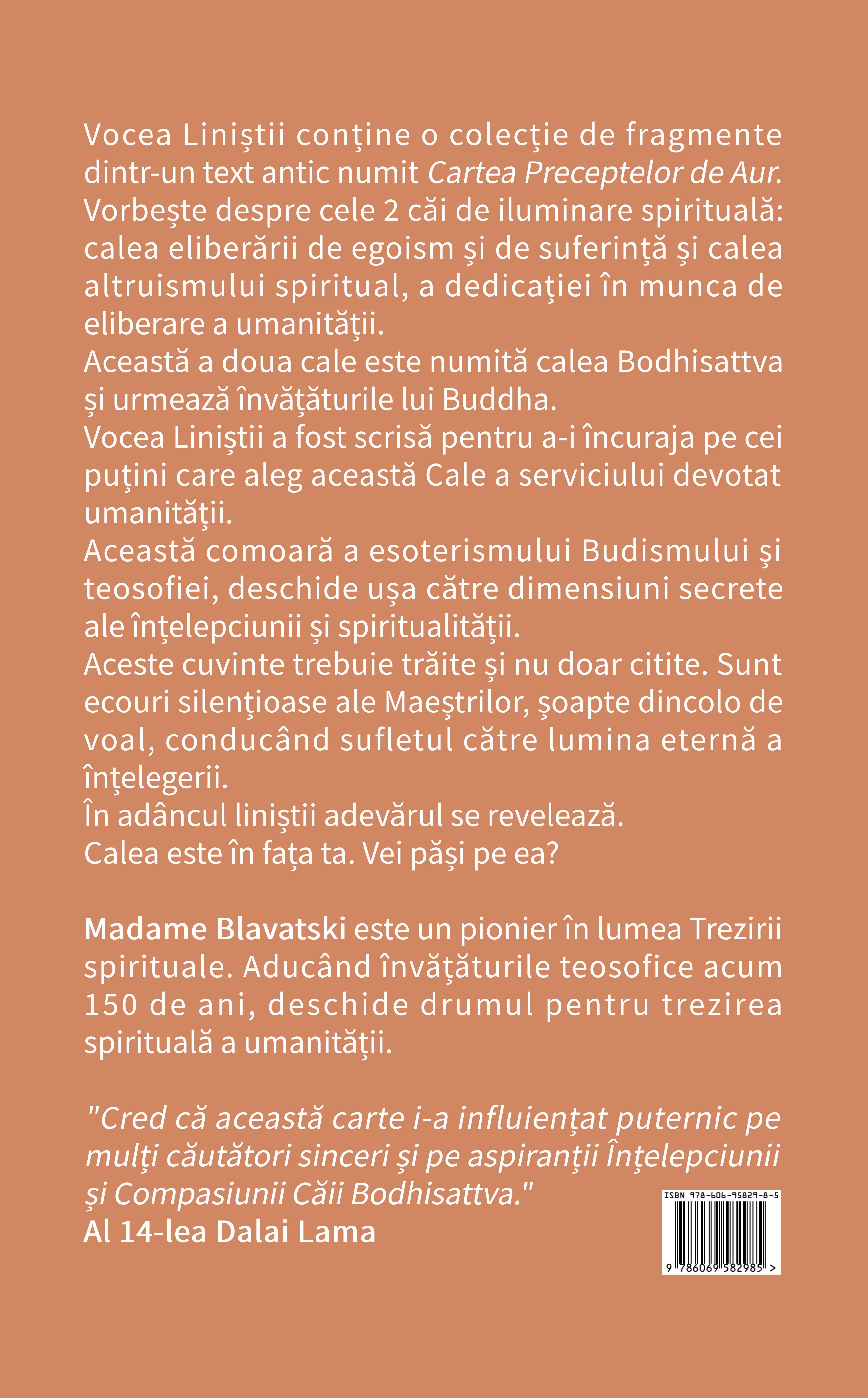 Vocea Linistii contine o colectie de fragmente dintr-un text antic numit Cartea Preceptelor de Aur. Vorbeste despre cele 2 cai de iluminare spirituala: calea eliberarii de egoism si de suferinta si calea altruismului spiritual, a dedicatiei in munca de eliberare a umanitatii. Aceasta a doua cale este numita calea Bodhisattva si urmeaza invataturile lui Buddha.