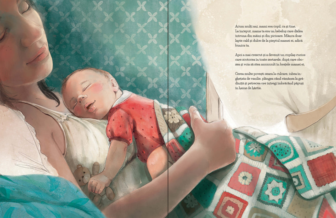 Luați-vă copilul în brațe și porniți împreună într-o călătorie pe care nici el, nici voi, părinții, n-o s-o uitați niciodată: copilăria mamei, cu trăsnăi și planuri, întâlnirea ei cu cel care-i va deveni soț, dorința lor de a crea împreună pe cineva mai bun decât ei doi la un loc, sarcina plină de dragoste, nașterea cu efort și speranță, firul invizibil care leagă orice copil de mama lui, care crește și învăluie totul chiar și când mama e obosită, nervoasă ori departe.