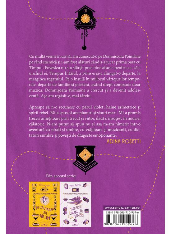 Cu multă vreme în urmă, am cunoscut-o pe Domnișoara Poimâine pe când era mică și i-am fost alături când s-a jucat prima oară cu Timpul. Povestea nu s-a sfârșit prea bine atunci pentru ea, căci unchiul ei, Tempus Întâiul, a prins-o și-a alungat-o departe, la marginea regatului său. Pe o insulă în mijlocul vârtejurilor temporale, departe de familie și prieteni, având drept companie doar muzica, Domnișoara Poimâine a crescut și-a devenit adolescentă. Așa am regăsit-o, mai târziu. Aproape să n-o recunosc cu părul violet, un tatuaj pe umăr, haine asimetrice și spirit rebel. Mi-a spus că are planuri și visuri mari. Mi-a promis treceri amețitoare prin trecut și viitor, dacă o însoțesc în noua ei călătorie. N-am putut să spun nu și așa m-am nimerit într-o aventură cu pirați și umbre, cu vrăjitoare și muzicanți, cu dictaturi sumbre și povești de dragoste emoționante. Adina Rosetti
