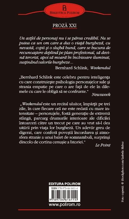 Pasionatii de fictiune istorica vor aprecia cu siguranta romanul Weekendul (2008). Protagonistul, Jorg, este un fost terorist al Rote Armee Fraktion (gruparea BaaderMeinhof), gratiat dupa douazeci si trei de ani de inchisoare, la care a fost condamnat pentru cele patru crime savirsite in numele unei revolutii in care nu mai credea aproape nimeni. Avind ca scop subminarea unui sistem corupt, acela al Germaniei anilor ’70, Jorg ajunge sa plateasca in fata justitiei in numele careia, de fapt, lupta. Problema moralitatii actiunilor sale si ale prietenilor sai din tinerete este dezbatuta printr-o confruntare directa cu Henner, Andreas, Ilse, Ulrich si Karin, cei alaturi de care impartasise idealurile sale revolutionare, in timpul unui weekend petrecut la conacul surorii lui Jorg, Christiane. Insa mult mai dureroasa este confruntarea dintre Jorg si fiul sau, Ferdinand, tinarul care a purtat intreaga viata stigmatul unui tata criminal si al unei mame sinucigase