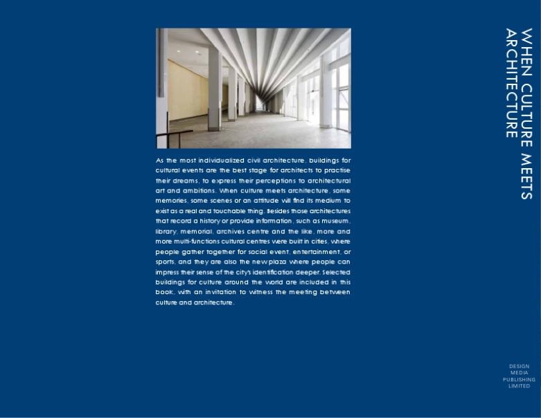 As the most individualized civil architecture, buildings for cultural events are the best stage for architects to practise their dreams, to express their perceptions to architectural art and ambitions. When culture meets architecture, some memories, some scenes or an attitude will find its medium to exist as a real and touchable thing. Besides those architectures that record a history or provide information, such as museum, library, memorial, archives centre and the like, more and more multi-functions cultural centres were built in cities, where people gather together for social event, entertainment, or sports, and they are also the new plaza where people can impress their sense of the city s identification deeper. Selected buildings for culture around the world are included in this book, with an invitation to witness the meeting between culture and architecture."