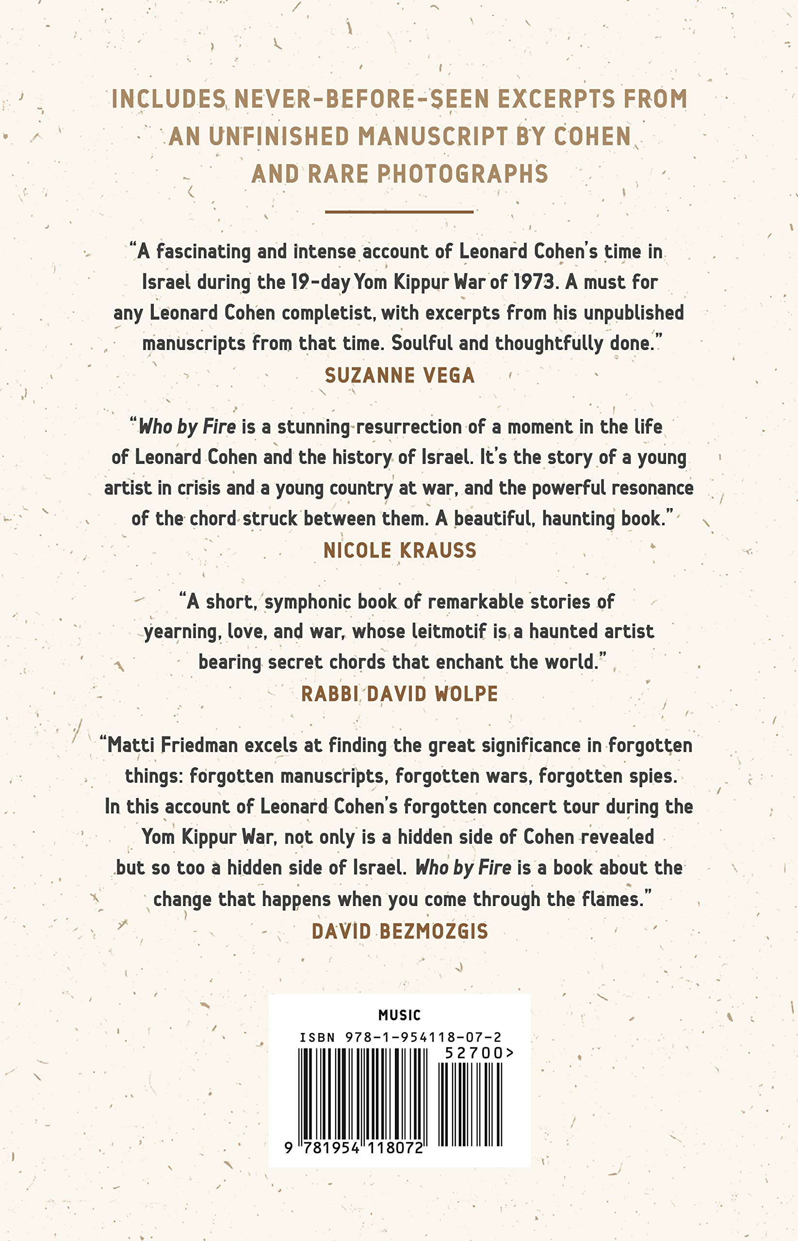 In October 1973, the poet and singer Leonard Cohen-thirty-nine years old, famous, unhappy, and at a creative dead end-traveled from his home on the Greek island of Hydra to the chaos and bloodshed of the Sinai desert when Egypt attacked Israel on the Jewish high holiday of Yom Kippur. Moving around the front with a guitar and a group of local musicians, Cohen met hundreds of young soldiers, men and women at the worst moment of their lives. Those who survived never forgot the experience. And the war transformed Cohen. He had announced that he was abandoning his music career, but he instead returned to Hydra and to his family, had a second child, and released one of the best albums of his career. In Who by Fire, journalist Matti Friedman gives us a riveting account of those weeks in the Sinai, drawing on Cohen's previously unpublished writing and original reporting to create a kaleidoscopic depiction of a harrowing, formative moment for both a young country at war and a singer at a crossroads.
